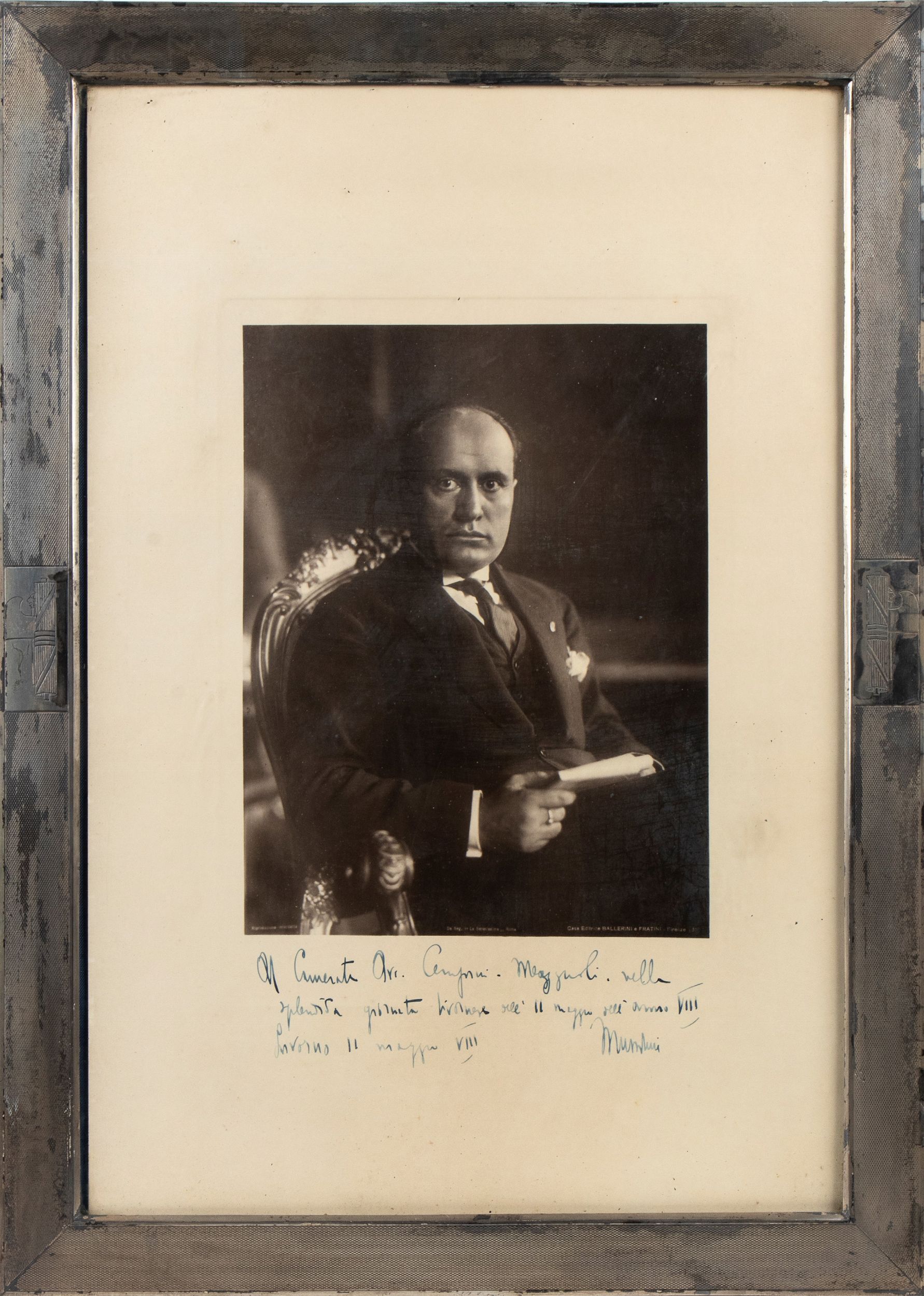 1930 Bellissima fotografia di Benito Mussolini in abiti civili, con dedica personale ascrivibile a episodio di vita privata, avvenuto a Livorno l'11 maggio del 1930; in splendida cornice d'argento ornata di fasci littori.