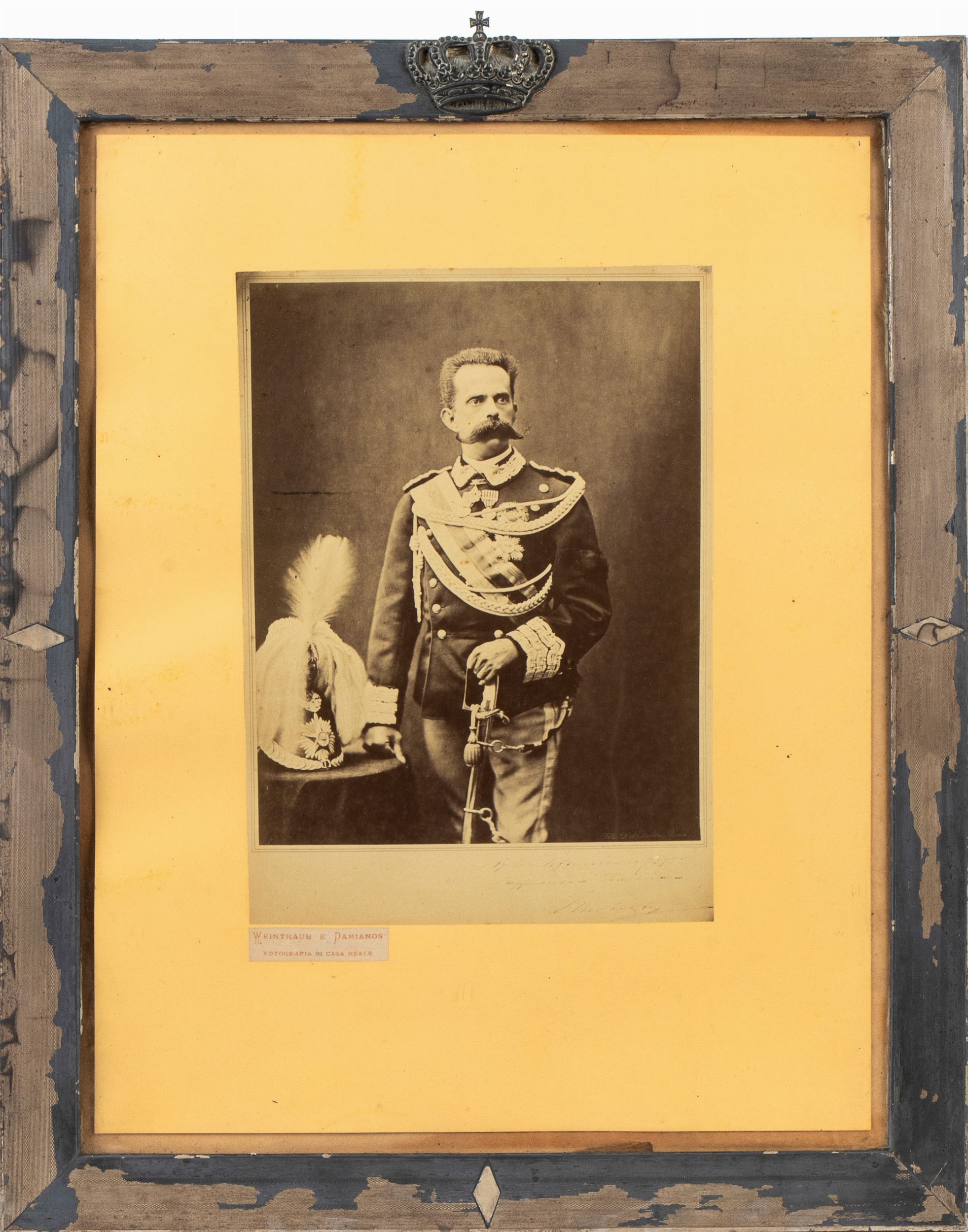 Fotografia di Re Umberto I in divisa da generale; firmata dal fotografo Weintraub; presenza di una dedica evanescente, non leggibile; in cornice coeva in argento ornata di corona reale, dono del sovrano.