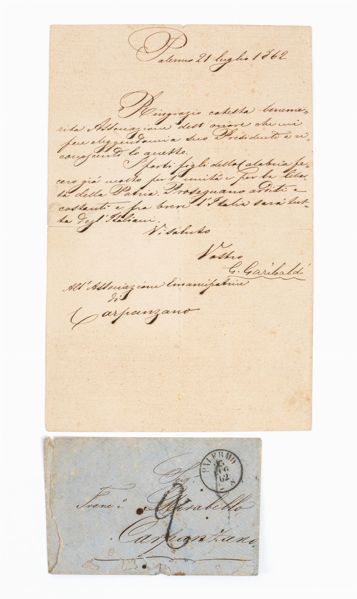 Lettera autografa con firma ad inchiostro nero, di Giuseppe Garibaldi. Il testo recita 'Palermo 21 Luglio 1862 - Ringrazio codesta benemerita Associazione dell'onore che mi fece eleggendomi a suo Presidente e riconoscente lo accetto. I forti figli della Calabria fecero già molto per l'unità e per la libertà della Patria. Proseguano arditi e costanti e fra breve l'Italia sarà tutta degl'Italiani. Vi saluto - Vostro - G.Garibaldi - All'Associazione Emancipatrice di Carpanzano' - Lettera completa di busta viaggiata e timbrata PALERMO 23 LUG 62.