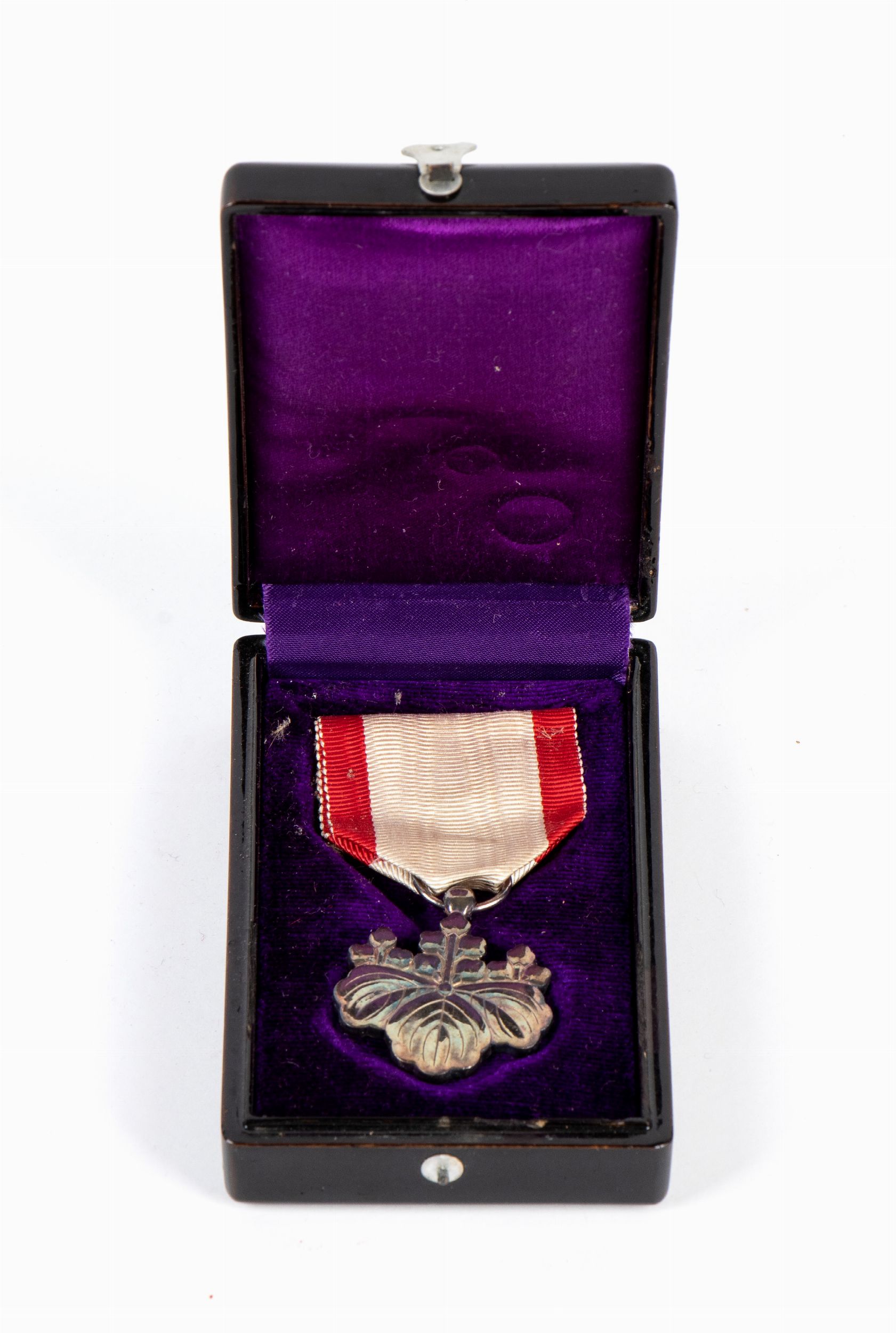 prima metà XX sec. Coniato in argento, con nastro originale, conservata nel suo astuccio originale in legno laccato foderato di seta viola, in ottimo stato
