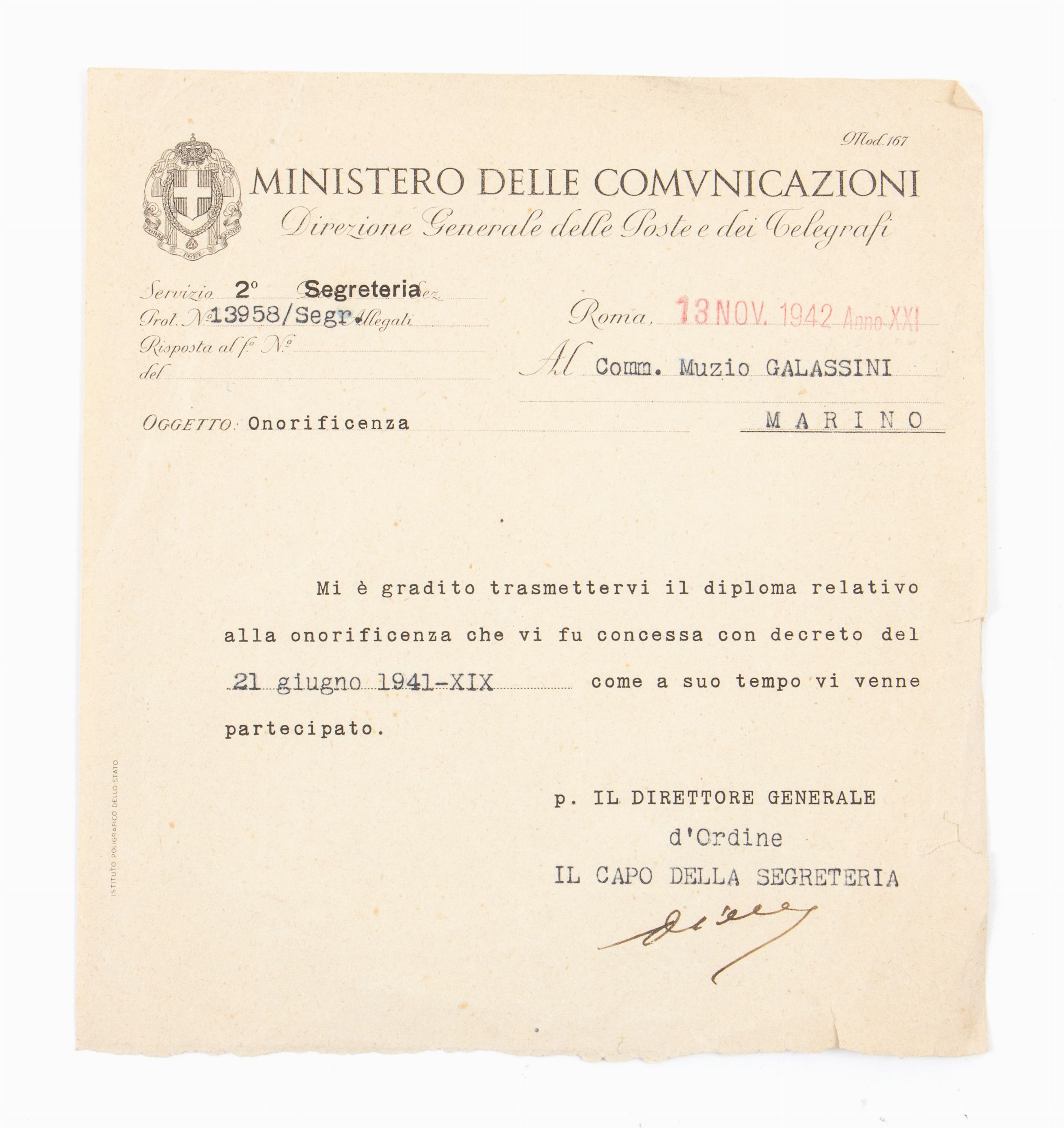 Lotto composto da un libretto dal titolo 'Tradizione e rivoluzione nei codici mussoliniani' con dedica e firma autografe ad inchiostro nero di Dino Grandi, libretto dell'opera dannunziana Cabiria, e lettera di assegnazione onorificenza cavalleresca. Mediocri condizioni.