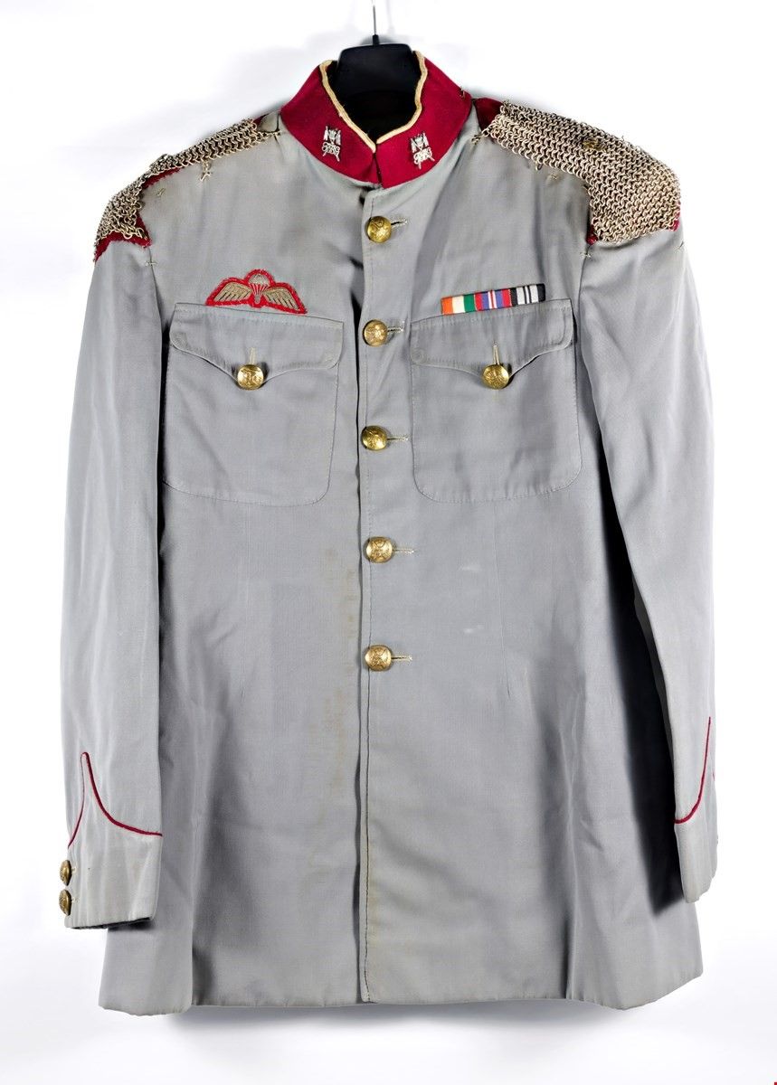 metà XX sec. In diagonale grigio con collo amaranto caricato dei fregi di specialità in metallo bianco, spalline a maglia di ferro, in ottimo stato.