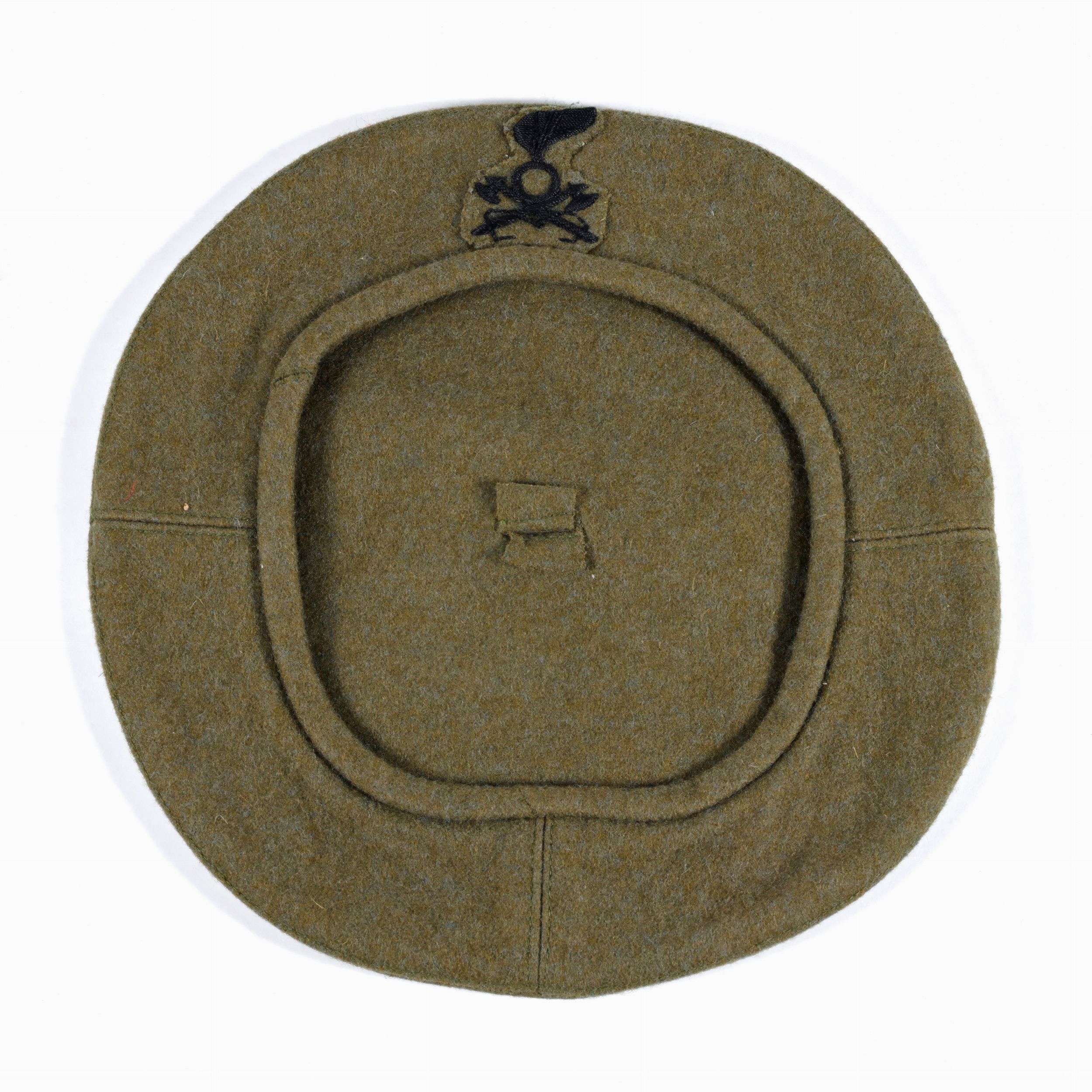 prima metà XX sec. Basco in panno di lana cachi costruito in cinque pezzi, fregio frontale del genio in filo nero, in ottimo stato.