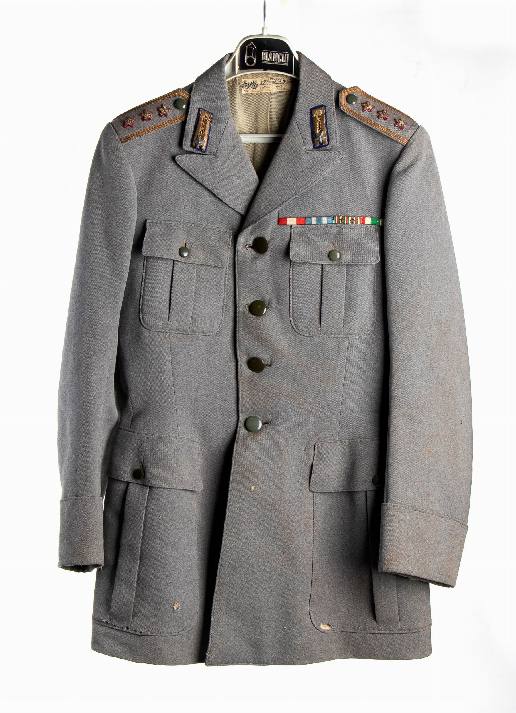 prima metà XX sec. In cordellino di lana, bavero con alamari specifici del servizio, controspalline fisse bordate di galloncino dorato, stellette in canottiglia dorata su fondo di panno robbio. Piccoli danni, buchi di tarma alla tasca destra inferiore, altrimenti in ottimo stato.