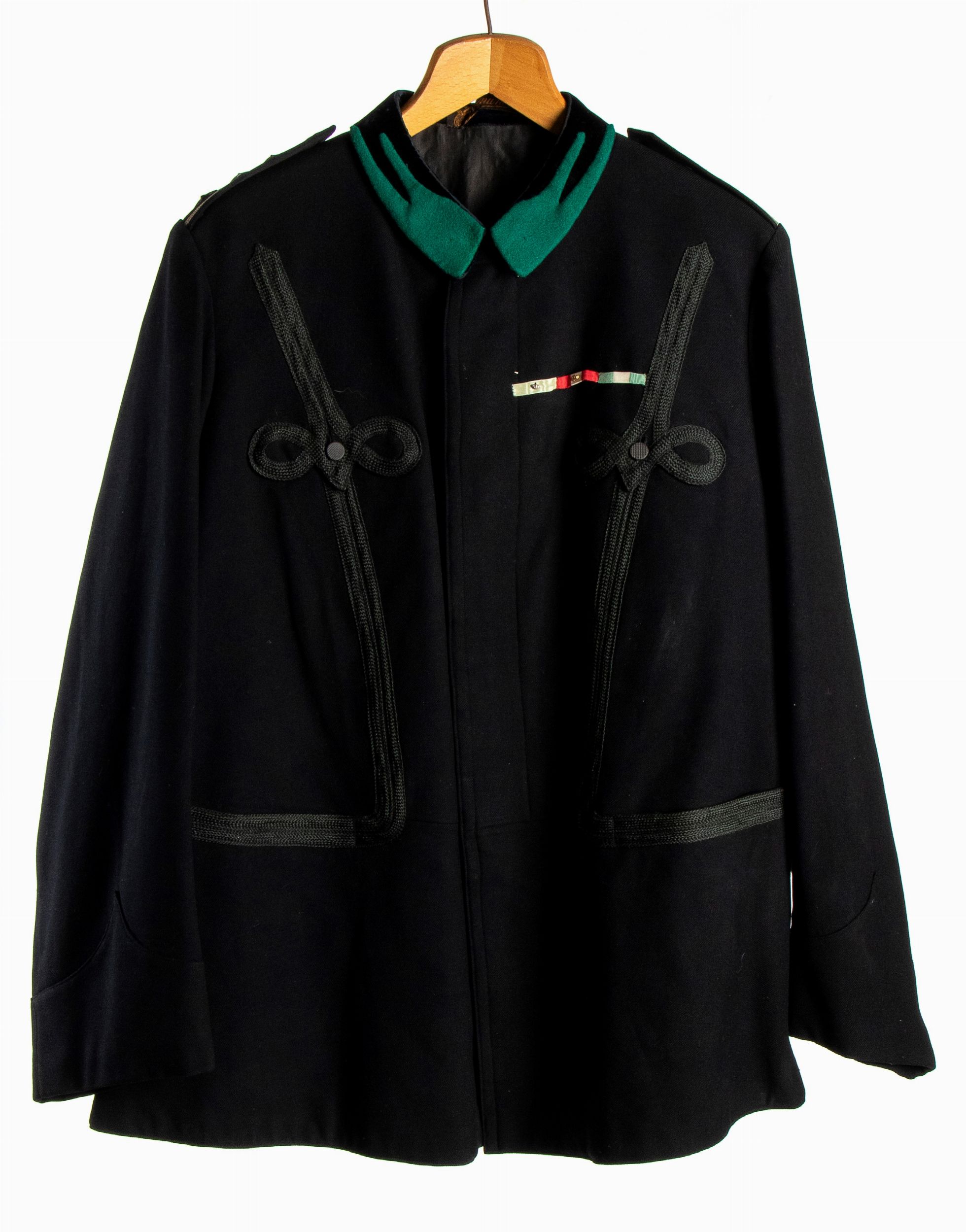 prima metà XX sec. Raffinato panno castorino nero con collo di velluto di seta caricato di fiamme verdi a due punte, controspalline bordate di gallone argento con stellette di grado metalliche. In ottimo stato.