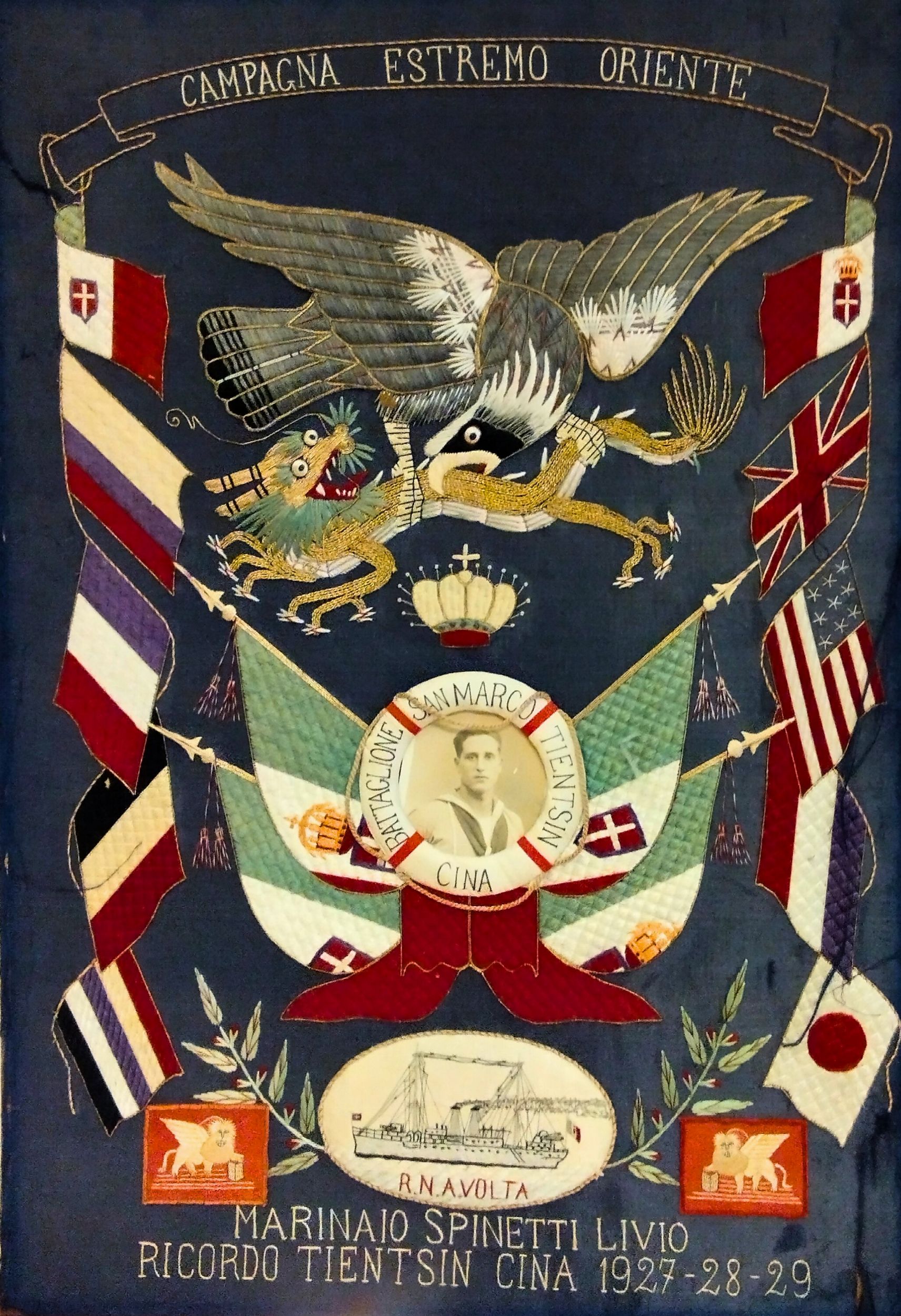 primo quarto XX sec. pannello in seta ricamata commemorativa la crociera in Cina, con elementi di richiamo patriottico e ritratto fotografico del Marinaio, tipico souvenir degli equipaggi di navi militari nei porti cinesi, interessante ed in ottimo stato