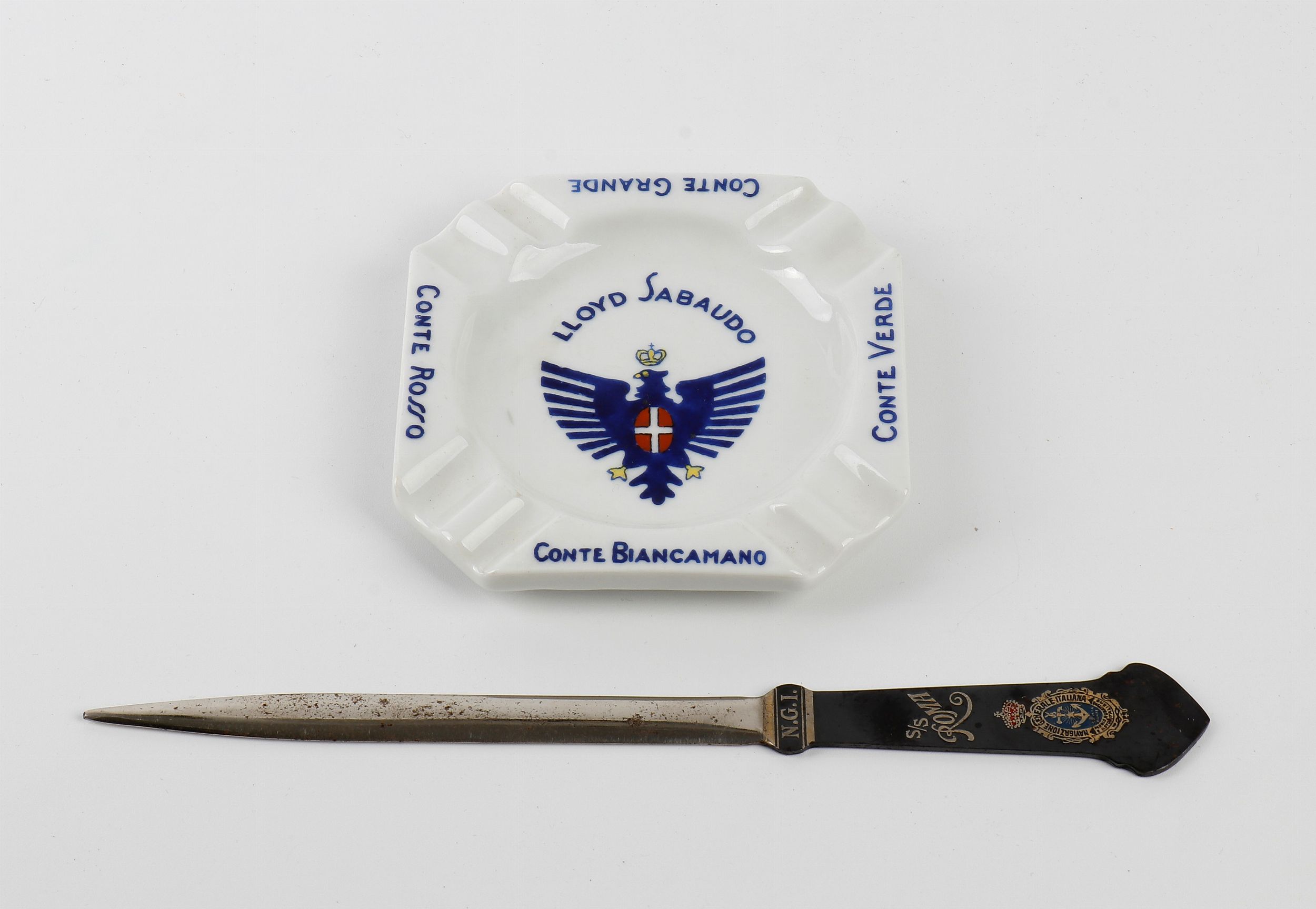 cm. 10 , cm.22 1920s Lotto di due pubblicitari, posacenere in ceramica della LLOYD SABAUDO Conte Verde - Conte Grande - Conte Biancamano , e tagliacarte della N.G.I. Navigazione Generali Italiana per la S/S ROMA. Ceramica marcato LAVENO Genova, nessuna rottura, lotto in buone condizioni. Misure tagliacarte cm.22 , posacenere circa cm.10x10