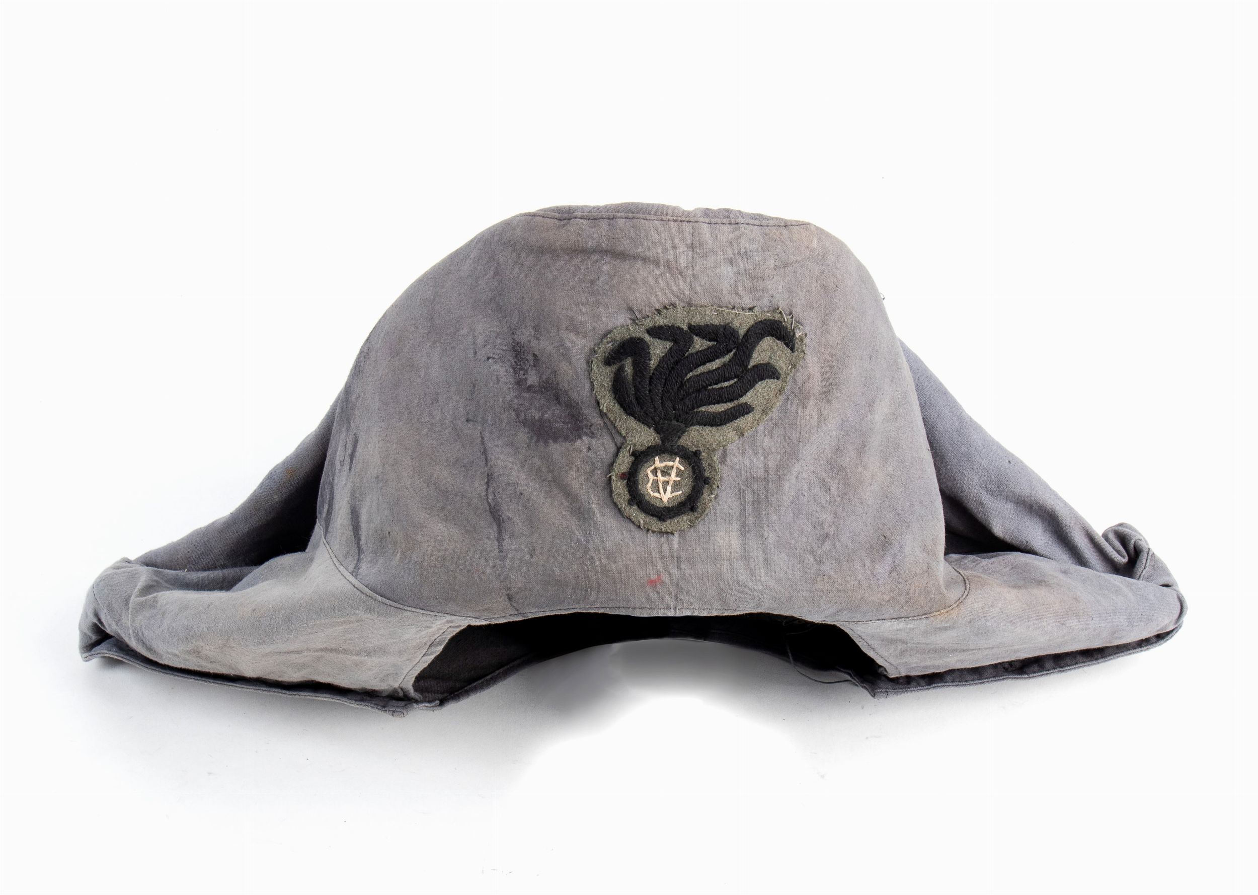 prima metà XX sec. Lucerna da Carabiniere con copertura mimetica in tela di cotone grigio con ampio fregio dell'arma, applicata al fusto di feltro nero senza attributi metallici, interno con fodera di cotone nero, fattura molto vecchia. In buono stato.