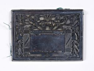 11x8 cm Placchetta della cassa di risparmio di Livorno in argento traforato ed inciso con racemi di alloro e quercia; [..]