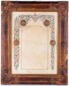 cm.61x76 Imponente cornice in cuoio sbalzato con all'interno una pergamena dipinta a mano, ma non compilata, recante [..]
