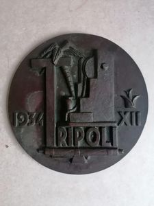 19 cm prima metà XX sec, Placca in bronzo con allegorie della città di Tripoli, datata 1934, in bella patina