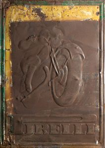 latta litografata, 49x69 1930s Tabella in latta litografata, pubblicitaria della PIRELLI , motocicletta in corsa, [..]