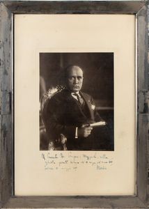 37x52 cm 1930 Bellissima fotografia di Benito Mussolini in abiti civili, con dedica personale ascrivibile a episodio [..]