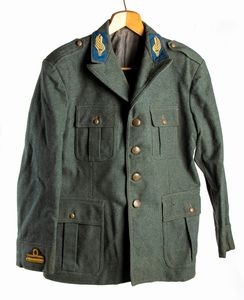 prima metà XX sec. In lana grigioverde con al collo bellissima coppia di mostrine in cotone giallo su panno azzurro, [..]