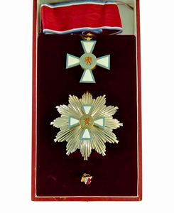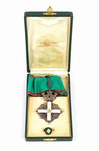 seconda metà XX sec. Bell'insegna dell'Ordine al Merito in argento e smalti, nastro originale conservata in astuccio [..]