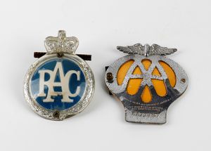 1960s Lotto di due badge per radiatore di automobile, AA Automobile Association inglese in metallo cromato e sfondo [..]