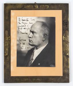 33x41 cm Foto in b/n di Benito Mussolini, in abiti civili, applicata su cartoncino rigido, con dedica e firma [..]