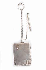 80x60 mm inizi XX sec. Metallo argentato con scudo Savoia in smalti policromi, anello con nodo d'amore e catenella [..]