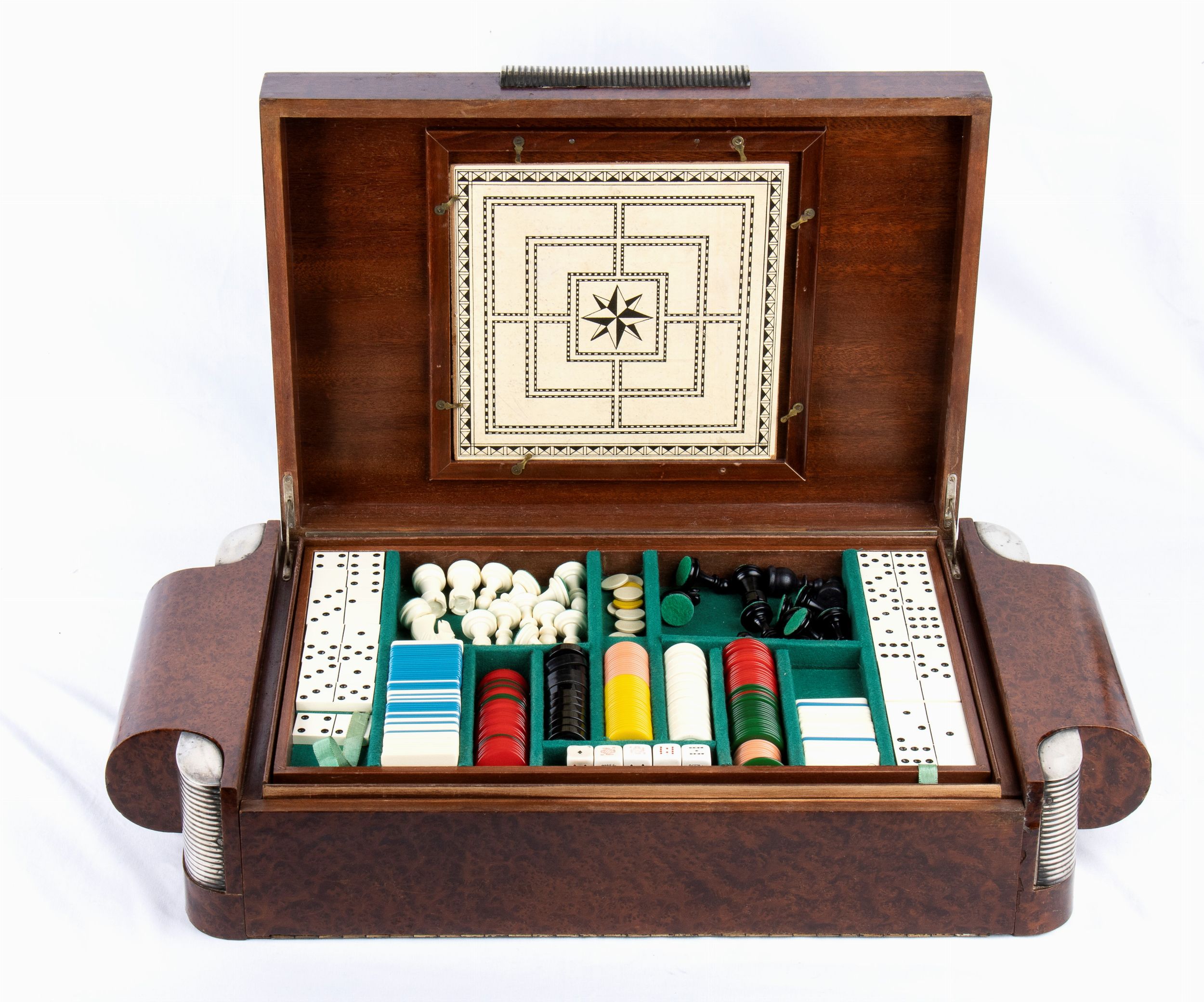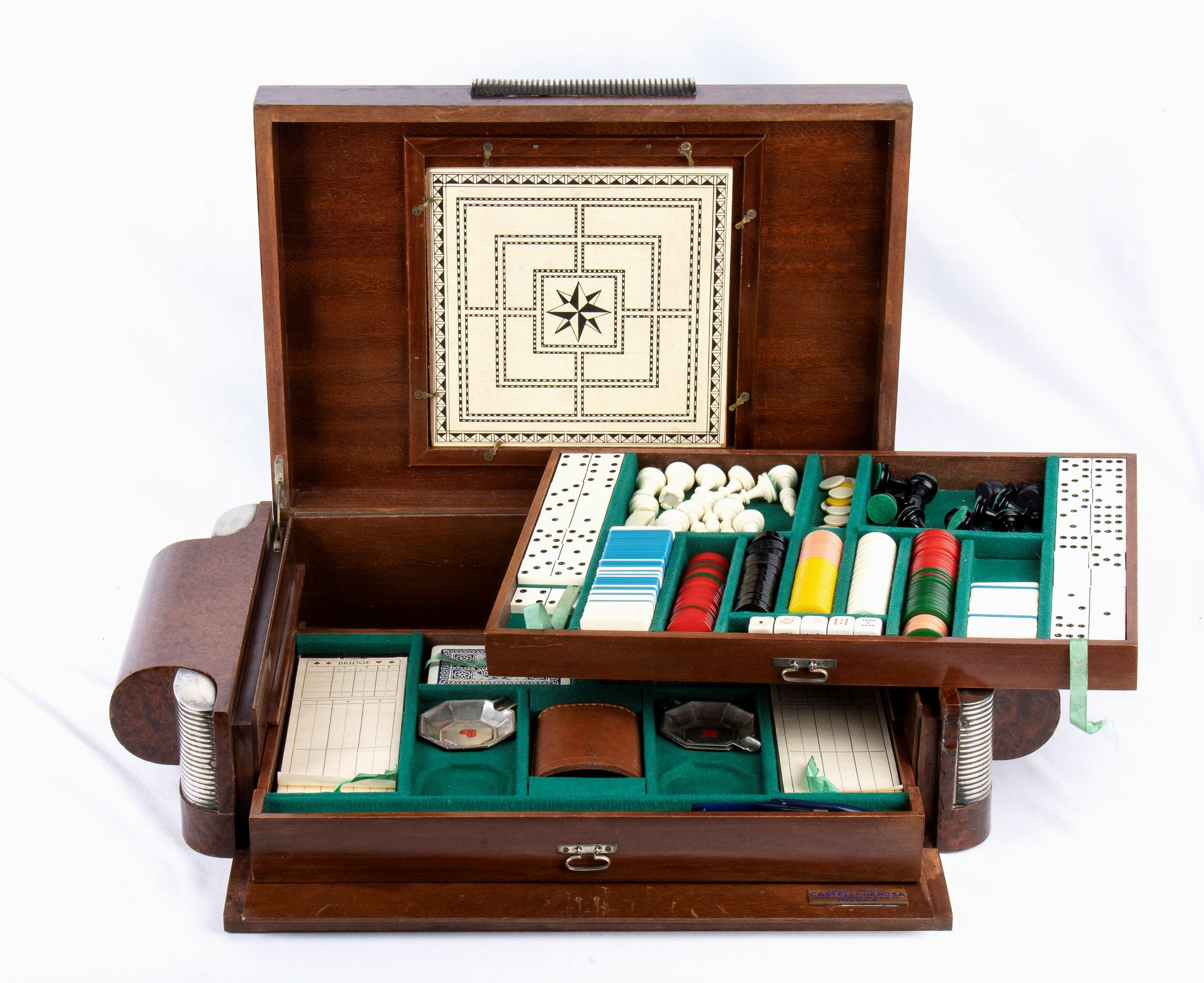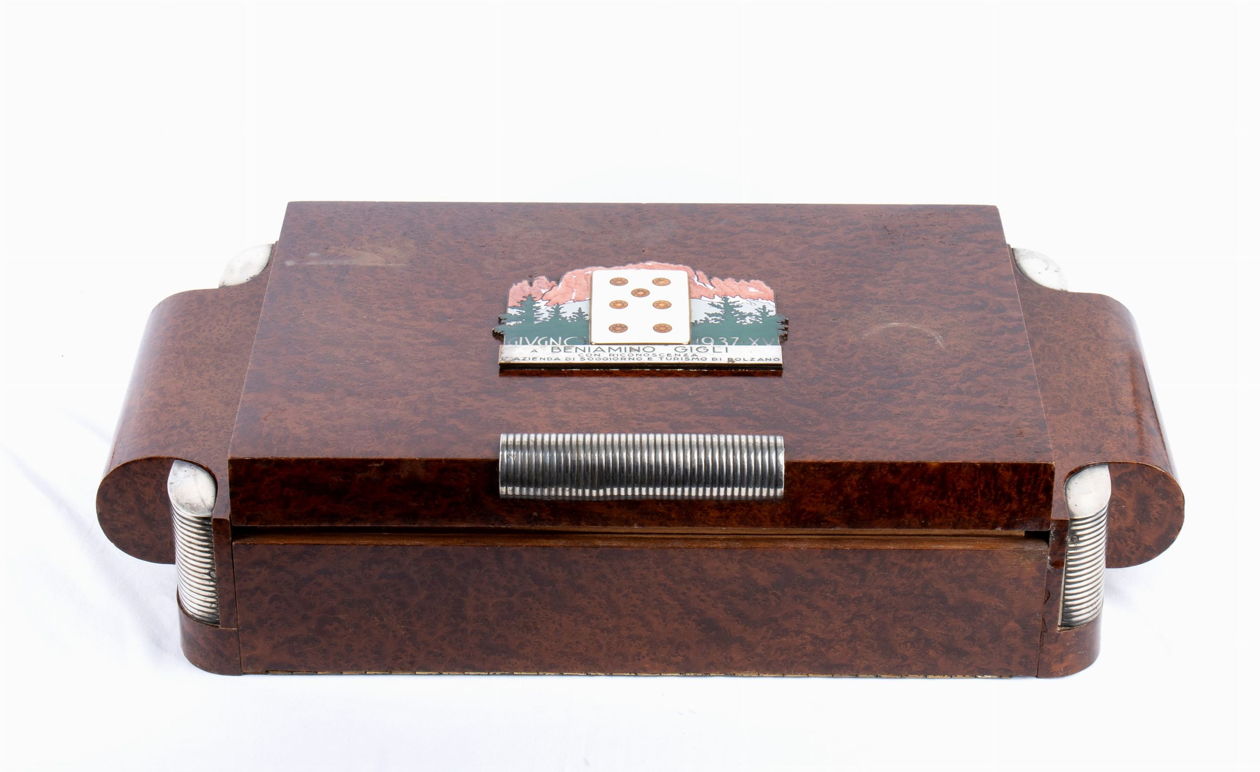 Preziosa scatola da gioco in legno e radica, con applicazioni in metallo argentato, con placca smaltata al centro del coperchio recante la dedica 'A BENIAMINO GIGLI - CON RICONOSCENZA L'AZIENDA DI SOGGIORNO E TURISMO BOLZANO - GIUGNO 1937 - XV' . Omaggio della città di Bolzano al tenore Beniamino Gigli (Recanati, 20 marzo 1890 – Roma, 30 novembre 1957). La scatola è prodotta dalla CASTELLI GEROSA di Milano, Via Francesco Albani 20. Due ripiani di fiches, carte, dadi, portacenere (set non completi). In eccellenti condizioni. Misure circa cm.56x29x12,5