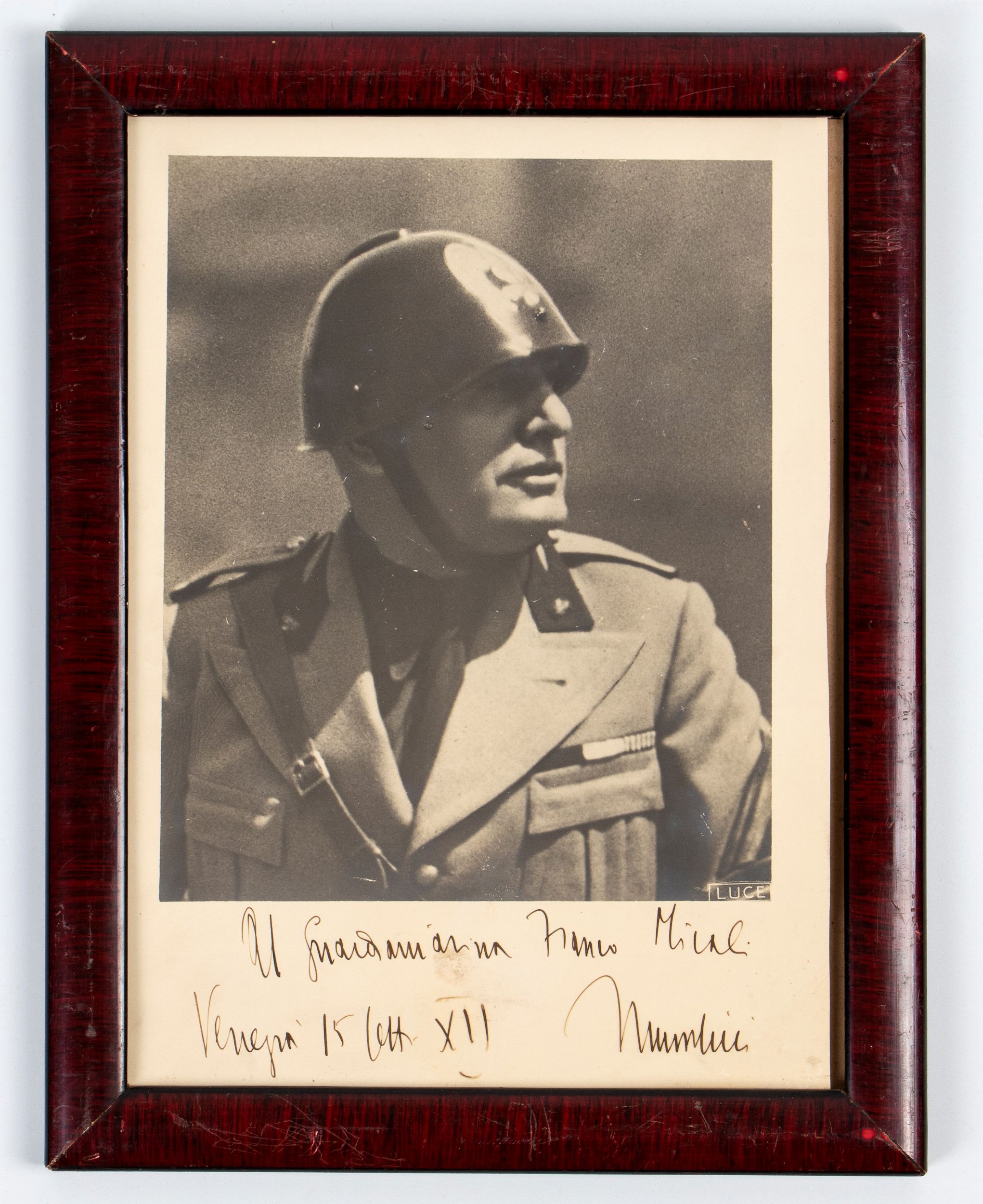 24x33 cm Foto b/n del Duce Benito Mussolini in uniforme da generale della Milizia Volontaria Sicurezza Nazionale, con elmetto modello 31, firmata LUCE in basso a destra, con dedica e firma autografe del Duce, ad inchiostro nero 'Al Guardamarina Franco Micali - Venezia 15 Sett XII - Mussolini'. In cornice coeva, misure foto circa cm. 24x33.