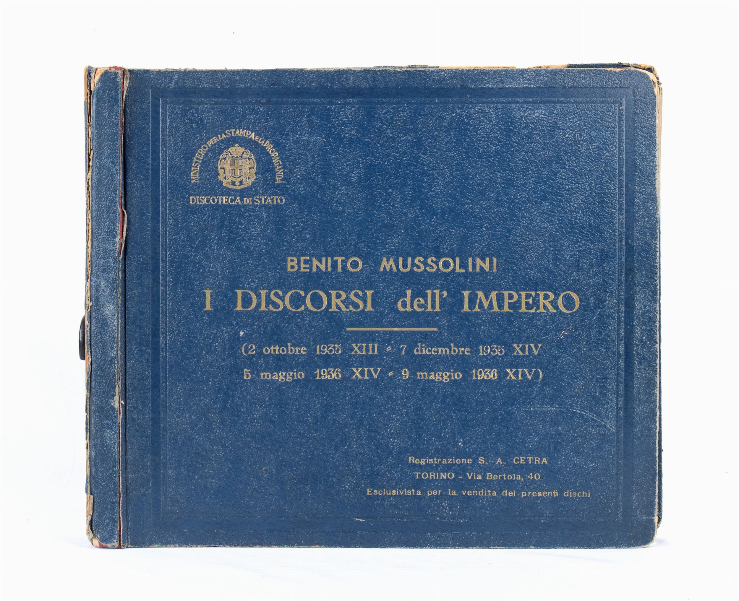 Raccolta completa dei dischi 78 giri editi dalla DISCOTECA DI STATO del MINISTERO PER LA STAMPA E LA PROPAGANDA, intitolata 'I DISCORSI DELL'IMPERO' di S.E. Benito Mussolini Capo del Governo Fascista. Presenti tutti gli 8 dischi con le incisioni dei discorsi del Duce tenuti dall' Ottobre 1935 al Maggio 1936, con registrazioni CETRA - Torino. Contenitore a libro originale, copertina rigida, buste interne per i dischi. In ottime condizioni, dischi in ottimo stato.