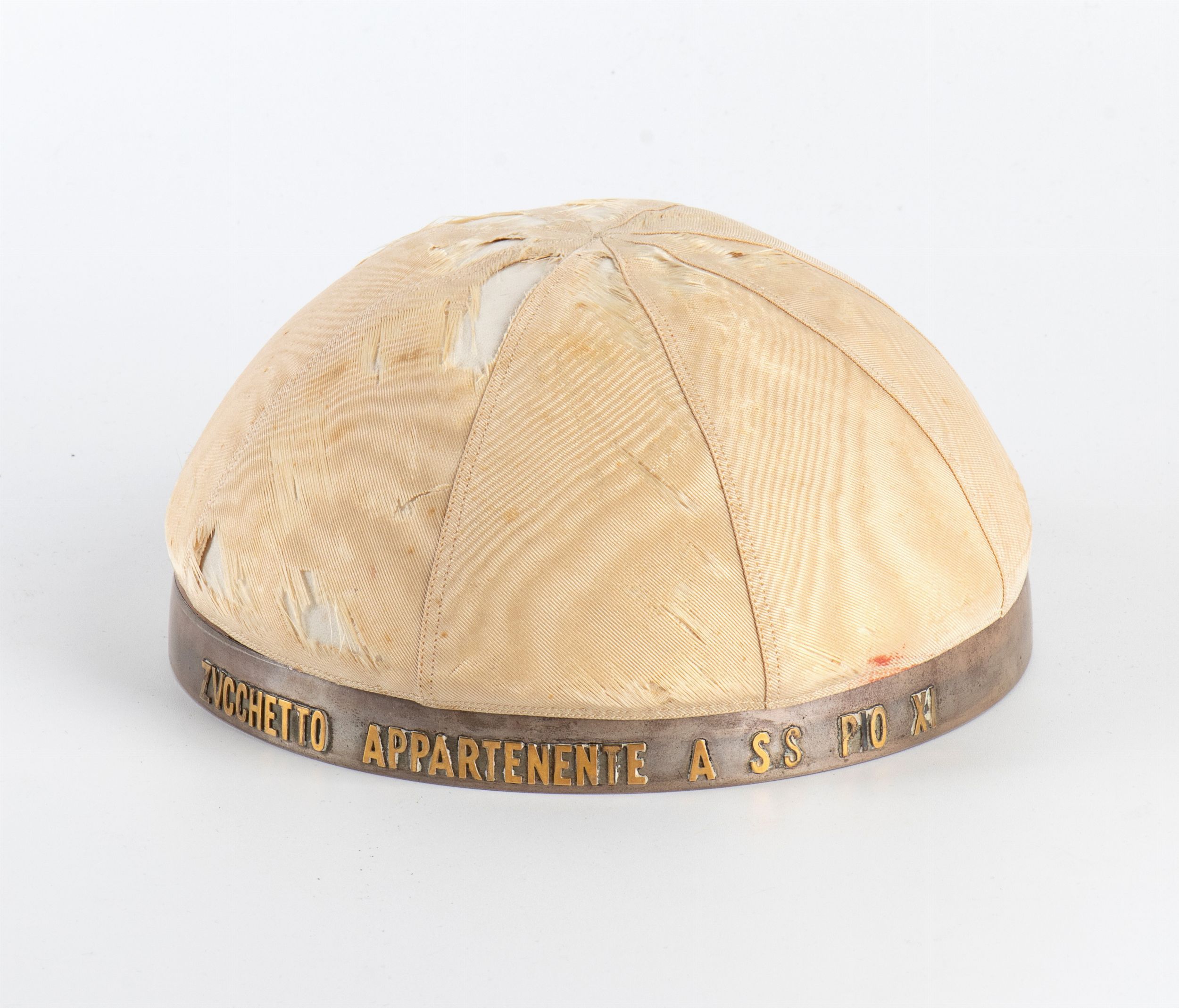 1930s Zucchetto originale usato da Sua Santità Papa PIO XI . Zucchetto in seta, conservato su supporto in legno con dicitura su fascia in metallo argentato a caratteri dorati, in rilievo, ZUCCHETTO APPARTENENTE A S.S. PIO XI Rarissimo cimelio, periodo 1930-1939 Lo zucchetto fu regalato dal Sommo Pontefice all'ingegnere Leone Castelli, responsabile dei lavori di ristrutturazione in Vaticano voluti da Pio XI e portati avanti nei dieci anni successivi ai Patti Lateranensi (1929). Pio XI, aveva incaricato Castelli, trasferitosi da Milano a Roma, di ricostruire uno Stato completo, lo Stato Vaticano, compresi gli edifici governativi e la ferrovia. A tal fine, furono demoliti praticamente tutti gli edifici intorno alla Basilica di San Pietro risalenti al XVI secolo (furono risparmiate solo Santa Marta Vecchia e la Chiesa degli Abissini). Strappi alla seta del coppo, usure varie. Lo zucchetto viene garantito originale con expertise, pur non avendo la certificazione della segreteria vaticana, considerata la circostanza della donazione particolare effettuata in tempi ormai remoti e dalla provenienza certa.