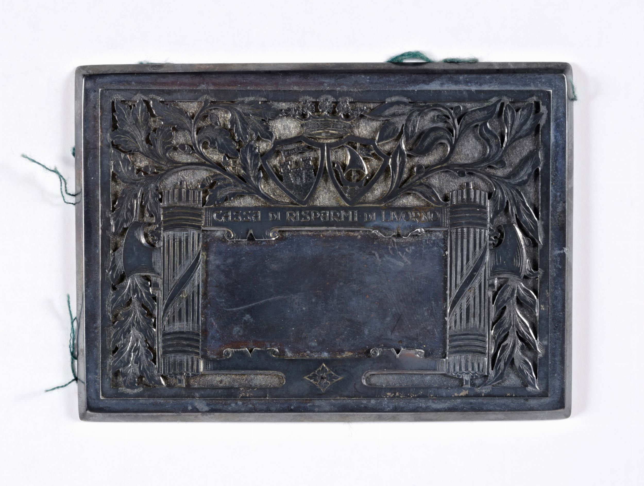 Placchetta della cassa di risparmio di Livorno in argento traforato ed inciso con racemi di alloro e quercia; fasci littori e stemmi nobiliari.