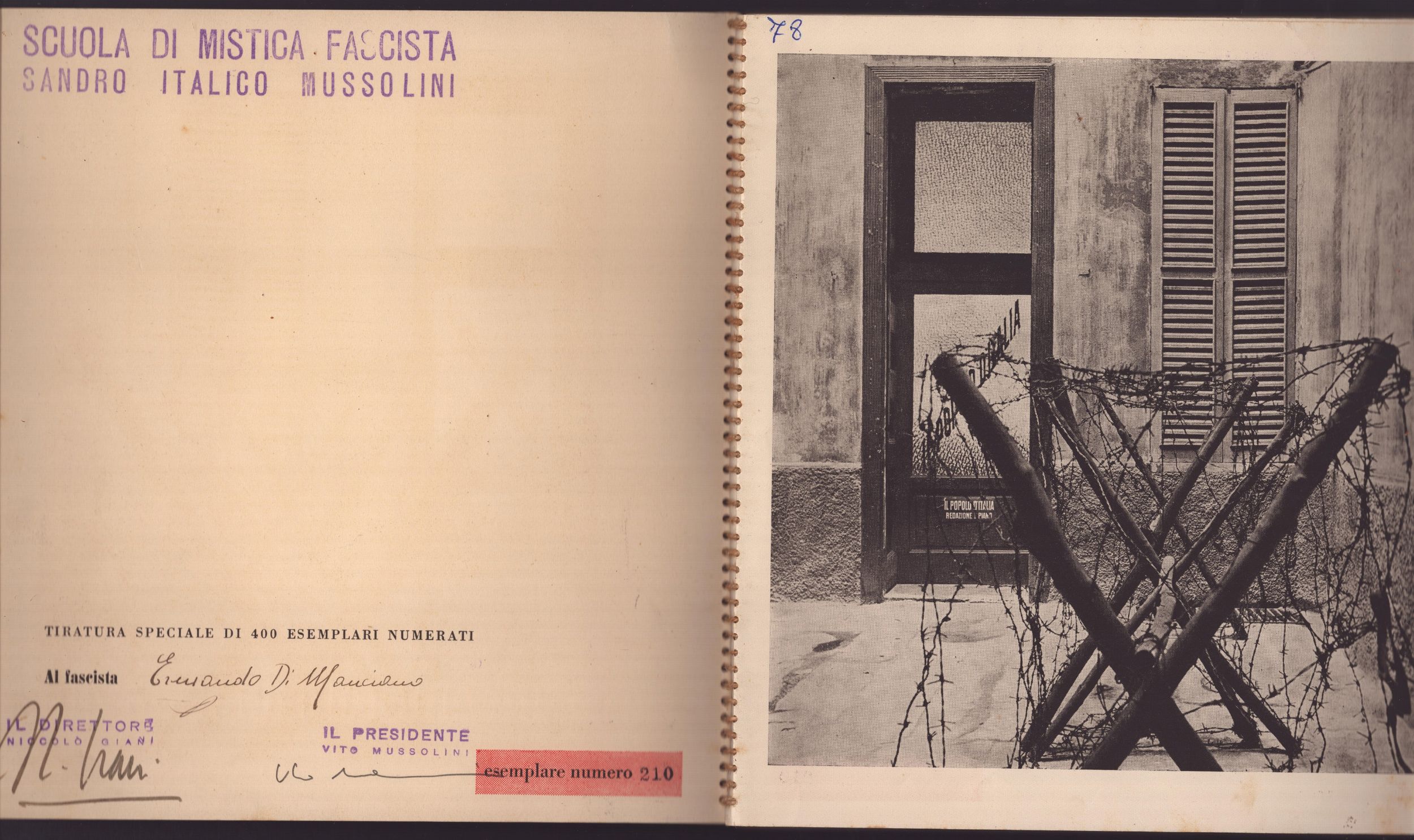 1939 Volume SPECIALE edito dalla Scuola di Mistica Fascista SANDRO ITALICO MUSSOLINI. Impaginato da Giuseppe Pagano, realizzazione grafica dell'Istituto Raffaello Bertieri, in Milano, 1940 anno XVIII - In 8° quadrato, circa cm.24 x 24, pp. 82, (4), brossura editoriale con illustrazione fotografica ai piatti del 'covo', testo in rosso e in nero, interamente illustrato con fotografie in b.n. nel testo, legatura a spirale, pagine piegate alla cinese. Rarissima edizione in tiratura speciale di 400 esemplari numerati, in cofanetto originale rivestito di tela di sacco, con fascio littorio e testo IL COVO stampato ad inchiostro nero. Questo è l'esemplare numero 210 dedicato al fascista E.d.M. con timbri del direttore Nicolò Giani e del presidente Vito Mussolini, accompagnati dalle rispettive firme autografe. Perfette condizioni.
