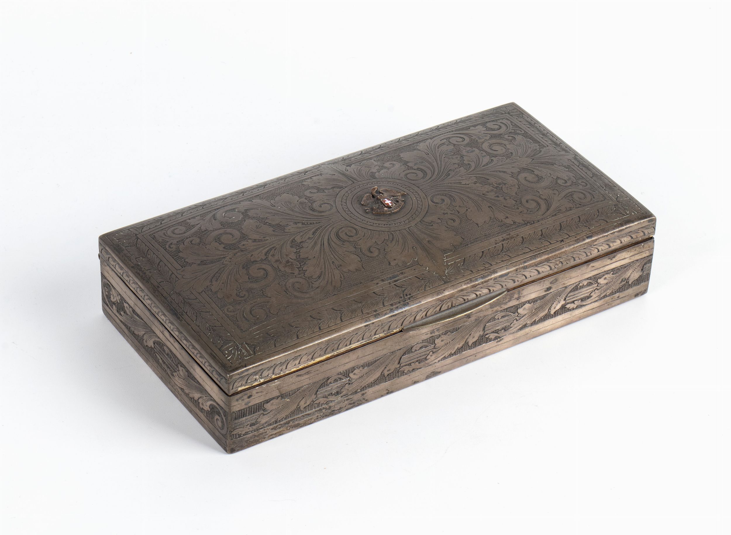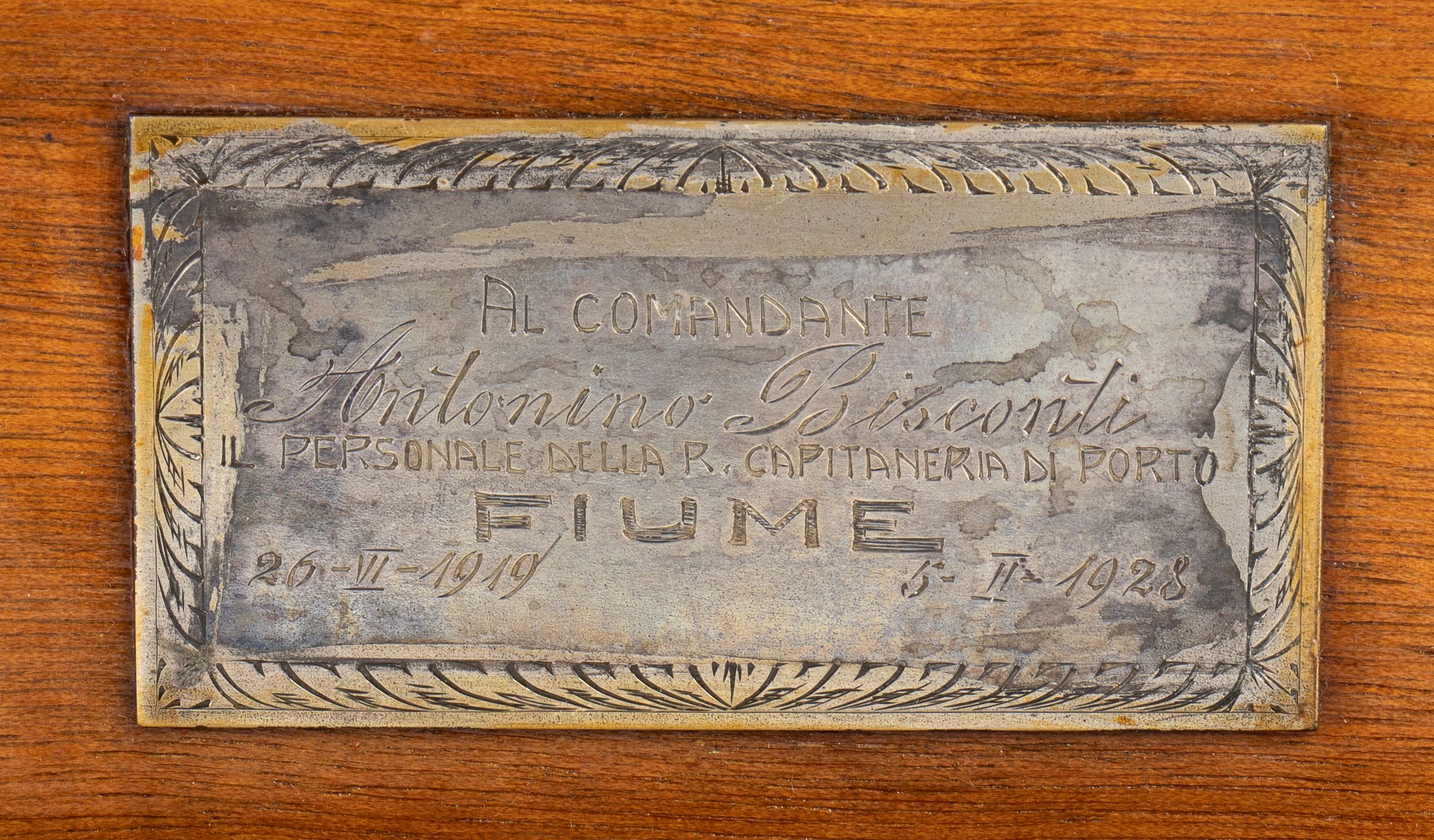21x11x6 1928 Cofanetto portasigari, in argento marcato 800 , con incisioni floreali a bulino, recante lo stemma di Fiume con l'aquila ad ali aperte (ad una sola testa) sovrastante il cartiglio INDEFICENTER con scudo smaltato di bianco e rosso in petto. All'interno del coperchio una targhetta in argento con incisa la dedica AL COMANDANTE ANTONINO BISCONTI IL PERSONALE DELLA R.CAPITANERIA DI PORTO - FIUME - 26 VI 1919 - 5 II 1928. Ottime condizioni