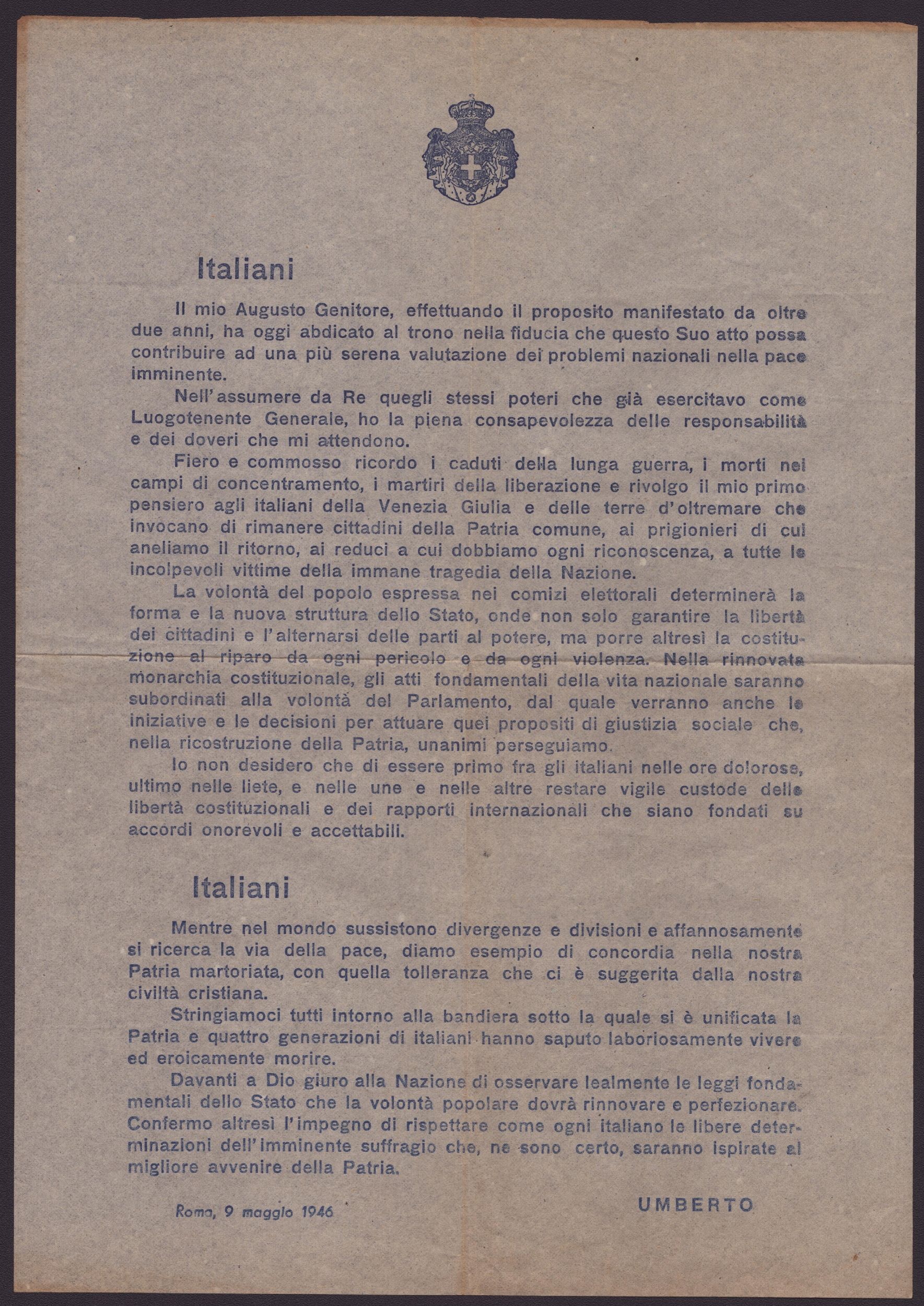 23x33 cm 1946 Rarissimo volantino a firma UMBERTO II , datato 9 Maggio 1946, in occasione della sua salita al trono quale successore a Vittorio Emanuele III che aveva appena abdicato al termine della Seconda Guerra Mondiale. Stampato su carta leggera che recita quanto segue 'ITALIANI- Il mio Augusto Genitore, effettuando il proposito manifestato da oltre due anni, ha oggi abdicato al trono nella fiducia che questo Suo atto possa contribuire ad una più serena valutazione dei problemi nazionali nella pace imminente. - Nell'assumere da Re quegli stessi poteri che già esercitavo come Luogotenente Generale, ho la piena consapevolezza delle responsabilità e dei doveri che mi attendono ... ndr ...' Misure circa cm.23x33 in ottime condizioni.