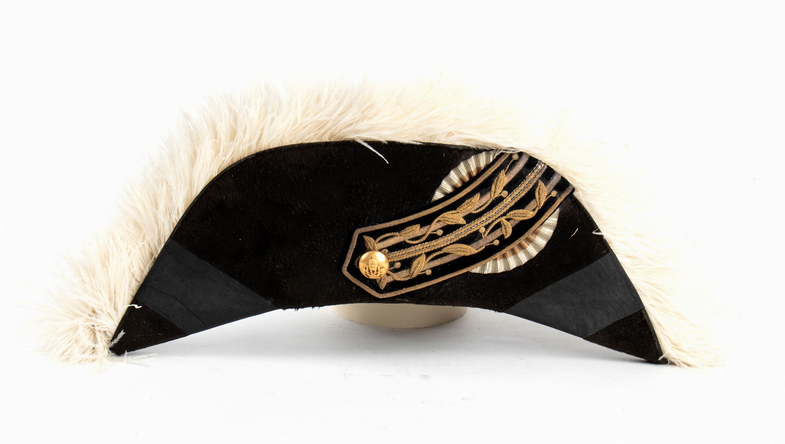 seconda metà XIX sec. Antica feluca di ordine cavalleresco o gentiluomo di Camera di Sua Santità , feltro bordato di piume di struzzo bianche, cappio a ricami oro su fondo nero con coccarda e bottone mezzo tondo con chiavi e tiara, fodera in seta nera con impresso lo stemma araldico del Papa regnante Leone XIII (1878-1903); in ottimo stato.