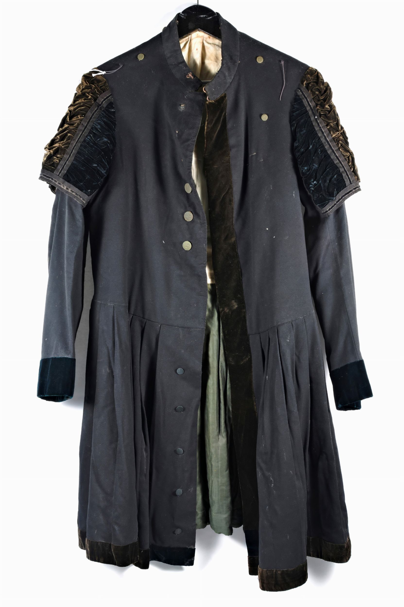 fine XIX sec. Antico vestito alla 'spagnola' da Cameriere segreto di Sua Santità , in fine panno di lana nero con polsino e spalle in velluto di seta nera, interno di cotone naturale trapuntato, pantaloni a mezzo polpaccio in panno bordato. In buono stato.
