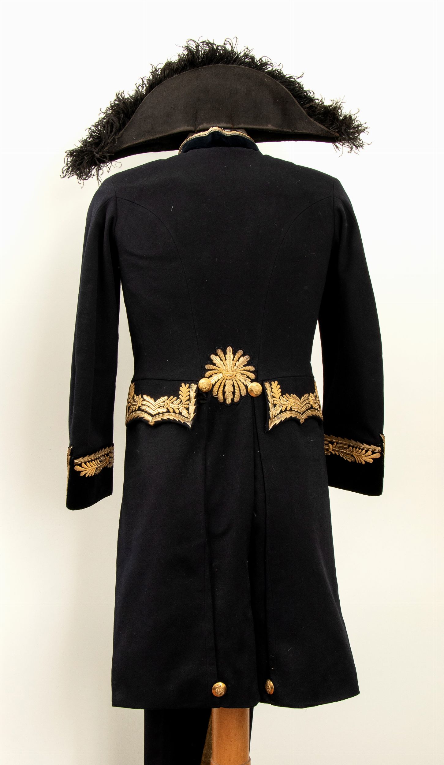 prima metà XX sec. Uniforme in raffinato castorino di lana con attributi ricamati al collo e ai paramani, pantaloni con banda dorata, feluca in feltro con attributi e penne di struzzo nere. In buono stato.