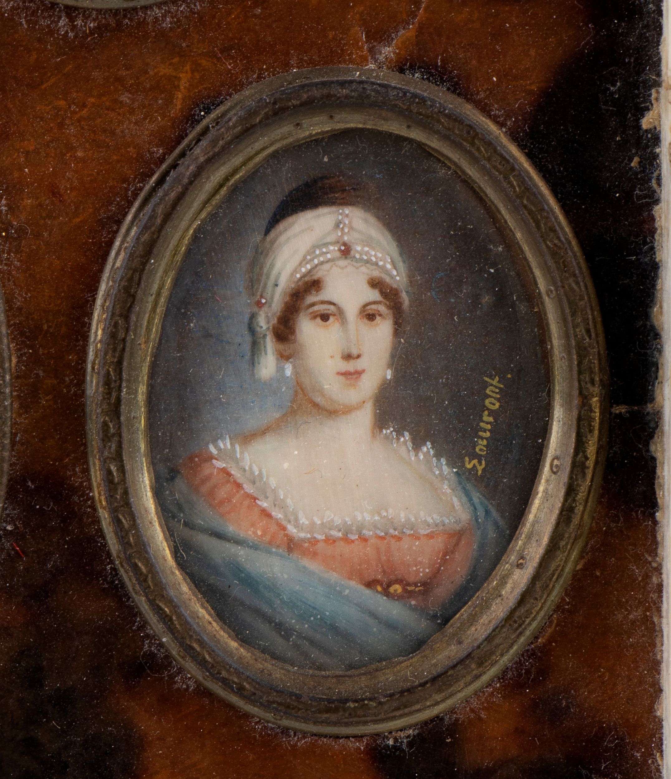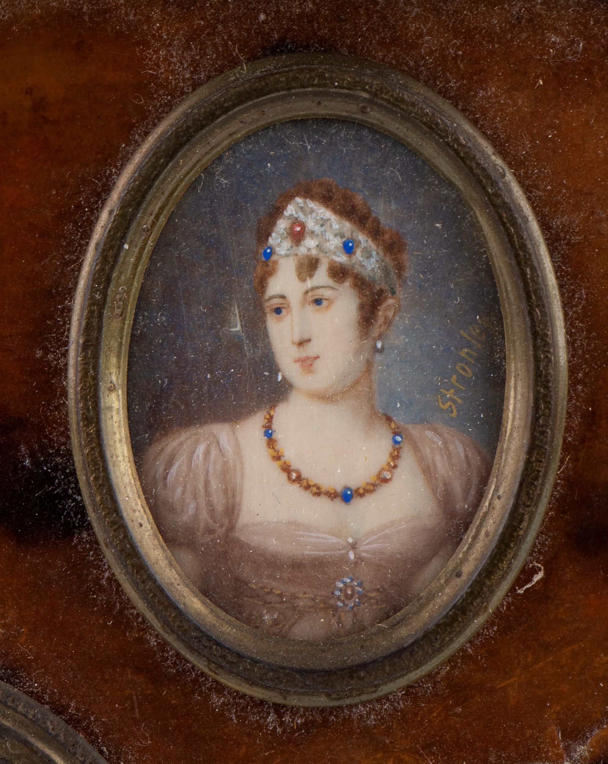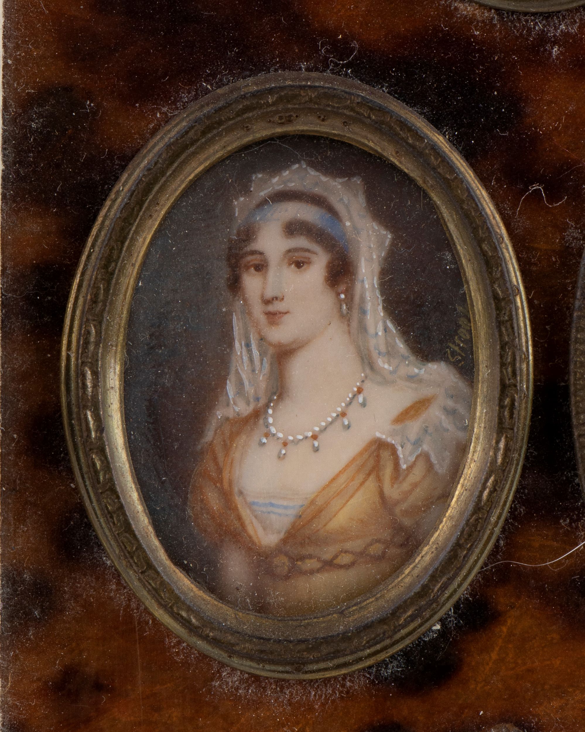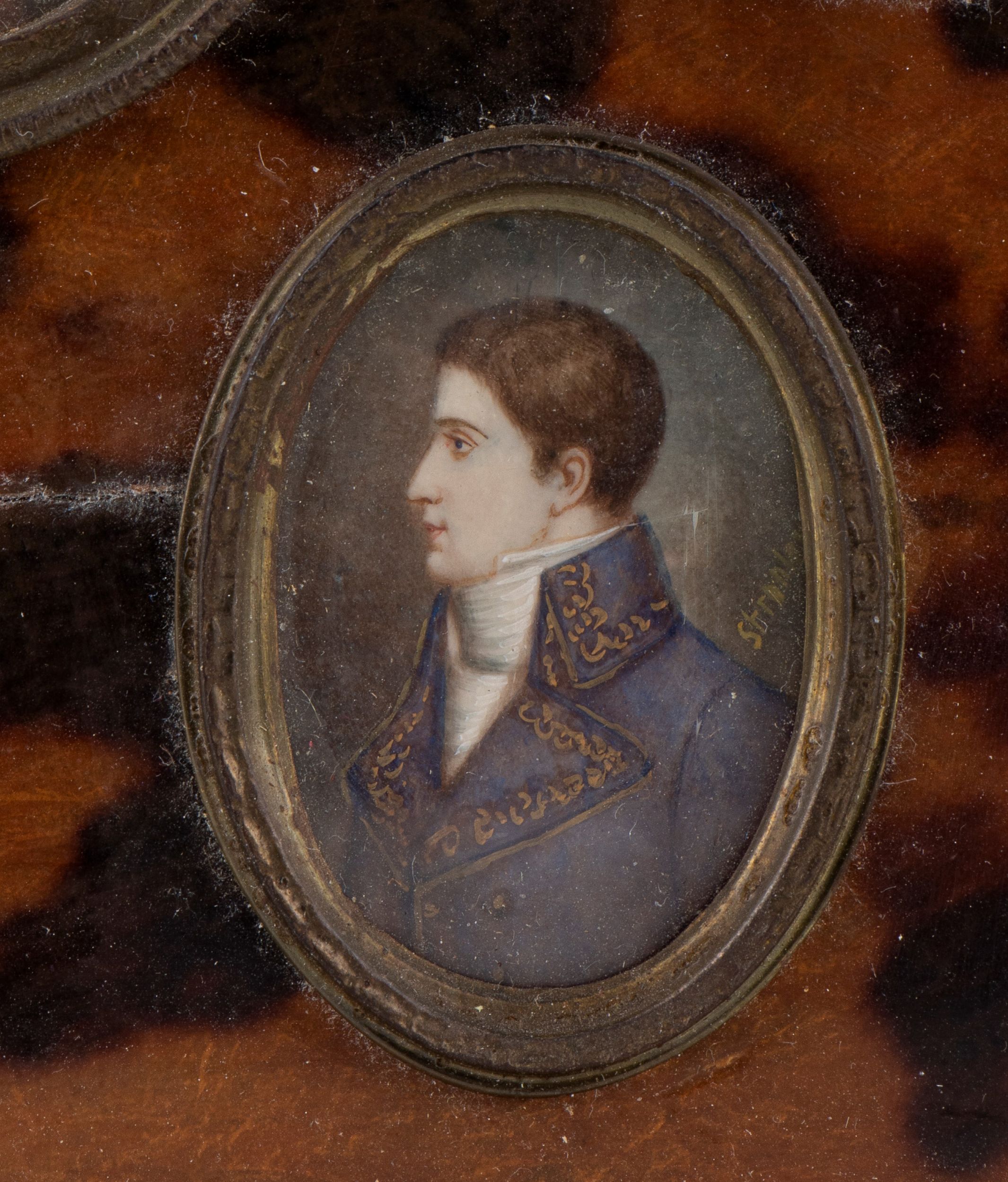 Raccolta di 7 ritratti in miniatura, su ovale ad acquarello, della famiglia di Napoleone Bonaparte, firmati da Lauront ed altri. I ritratti sono montati su una cornice coeva, con Napoleone al centro. In ottime condizioni