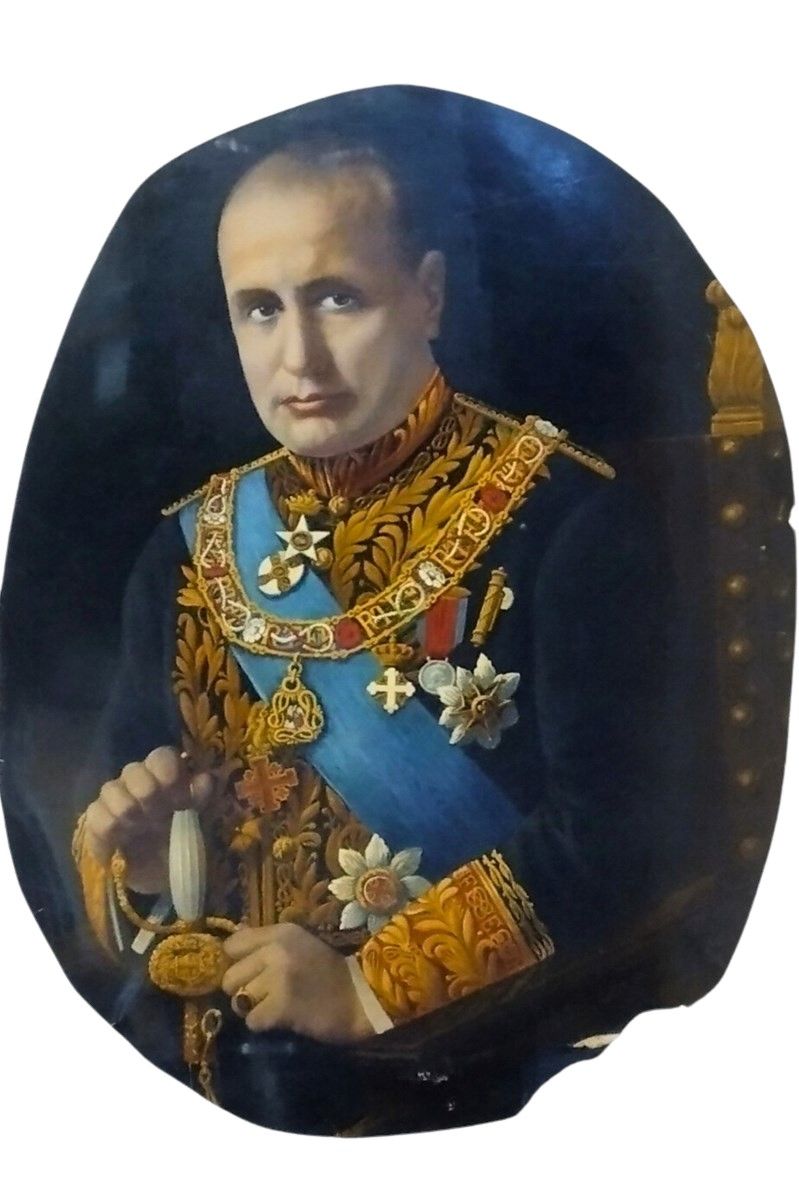 70x100 cm prima metà XX sec. Frammento di tela tagliato crudamente ad ovale raffigurante ritratto di Benito Mussolini in uniforme da primo ministro con collare della SS Annunziata e decorazioni pontificie, ritratto con ordini pontifici per commemorare i Patti Lateranensi, il frammento è conservato in cornice a giorno. Firmato ed in buono stato.