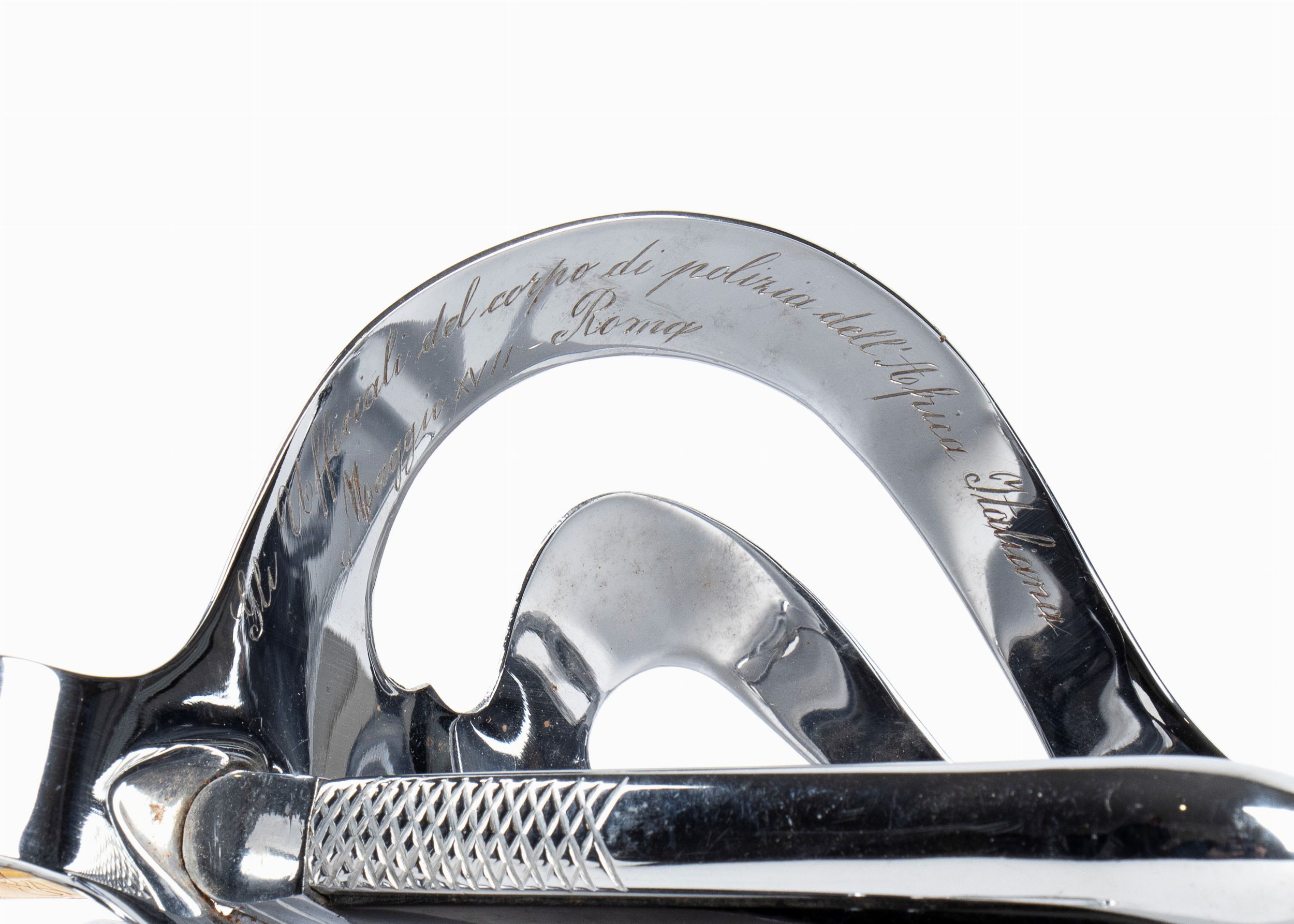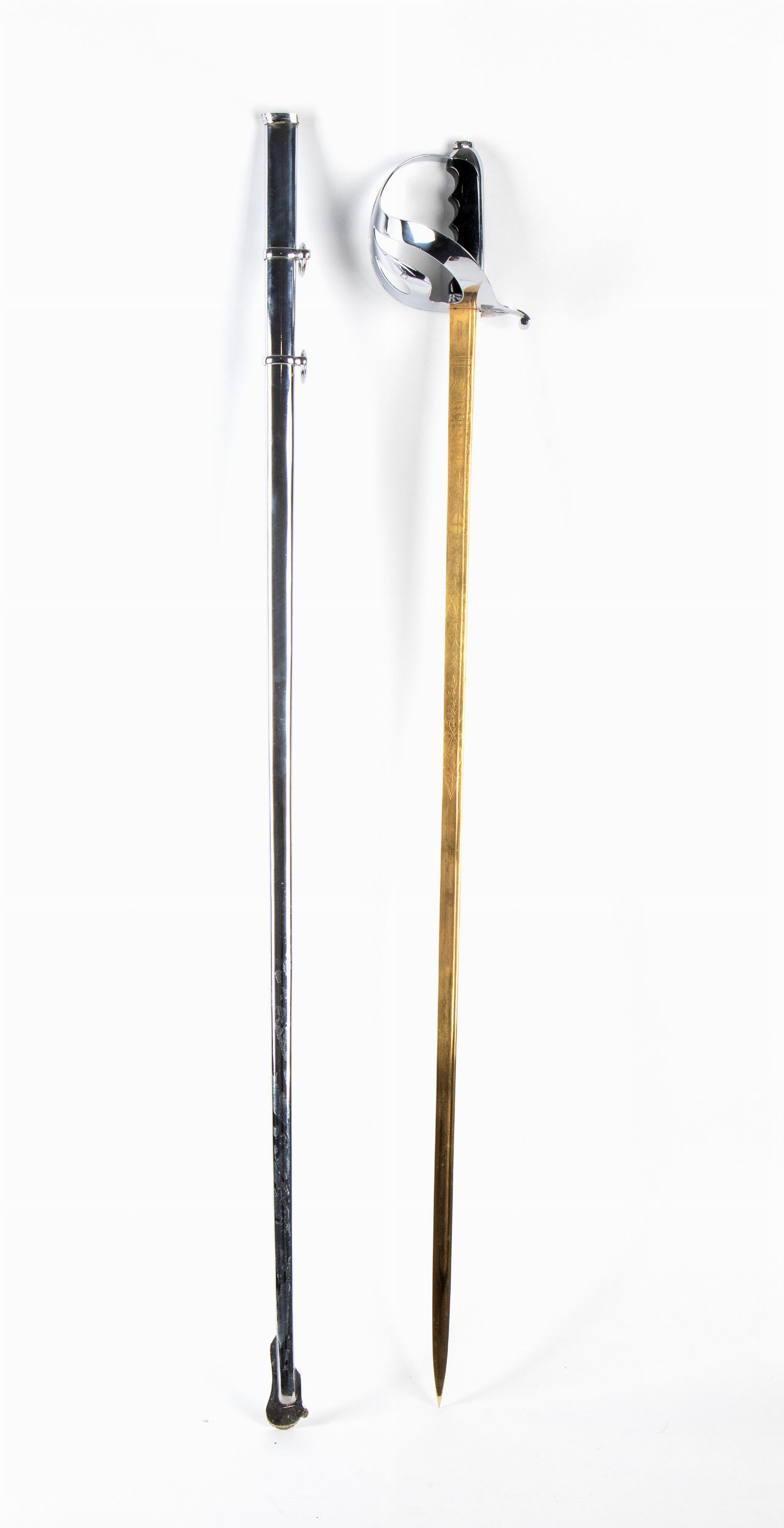 prima metà XX sec. Interessantissima spada da ufficiale modello 88 donata dagli ufficiali della Polizia Coloniale al Vice Governatore con dedica incisa all'interno della guardia, in metallo cromato, lama incisa ad acquaforte interamente dorata. In ottimo stato di conservazione, di libera vendita in quanto oggetto di rappresentanza e privo di filo o punta. Molto rara.
