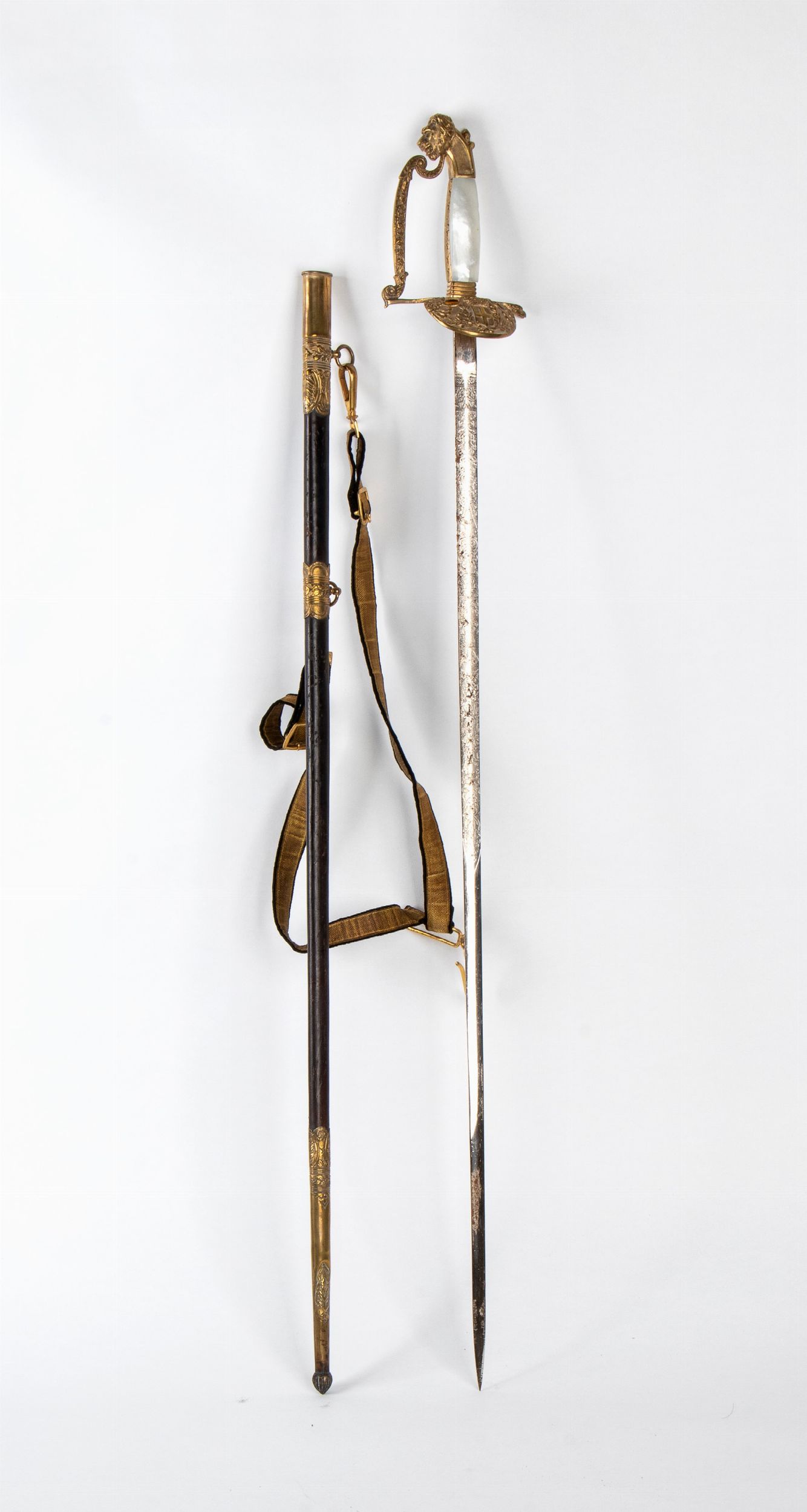prima metà XX sec. Bello spadino con impugnatura a testa di leone, guanciole di madre perla e pelta decorata di scudo savoia, fodero di pelle con inserti metallici dorati. In ottimo stato, di libera vendita in quanto, oltre ad essere un oggetto di rappresentanza, è privo di filo e punta.
