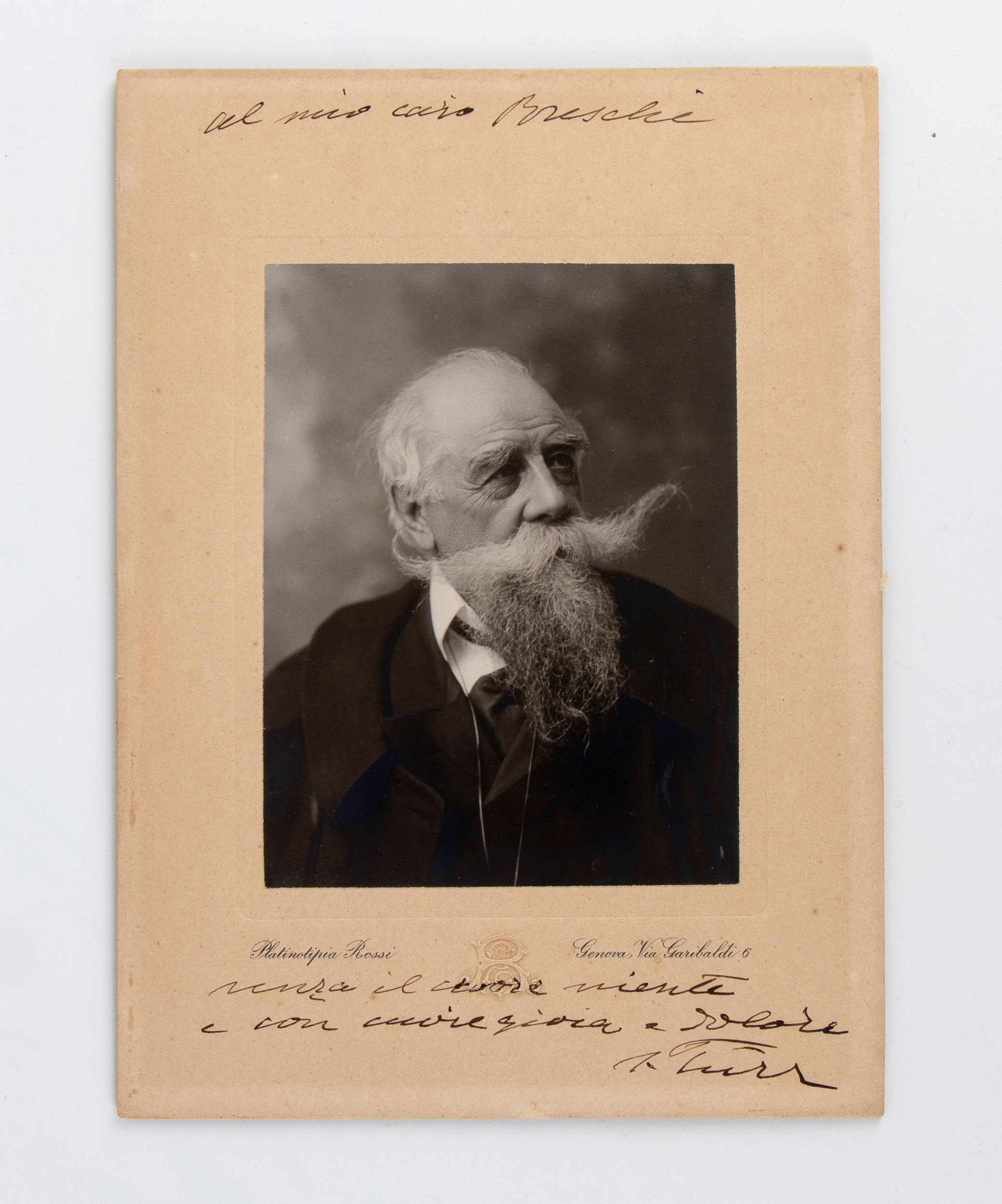 Fotografia in b/n del soldato garibaldino (Cacciatori delle Alpi, Spedizione dei Mille ) Stefano Istvan Turr, ungherese, con la dedica 'Al mio amico Breschi - Senza il cuore niente - e con ..... - I TURR' Fotografia applicata su cartoncino con dicitura PLATINOTIPIA ROSSI - GENOVA VIA GARIBALDI 6 Misura circa cm 15x20 Foto dedicata a Pier Giulio Breschi, nipote di Anton Giulio Barrili
