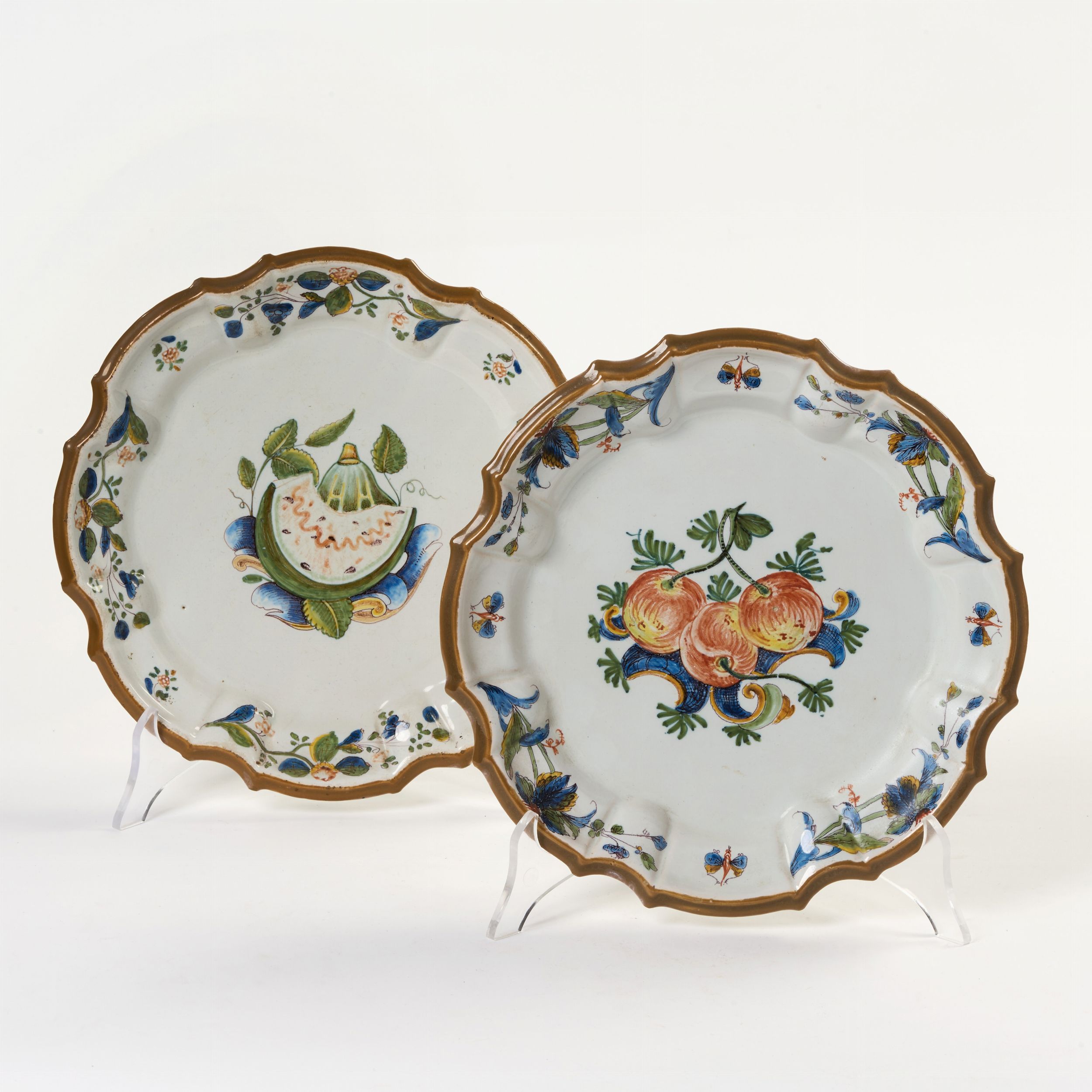 Due piatti in maiolica policroma