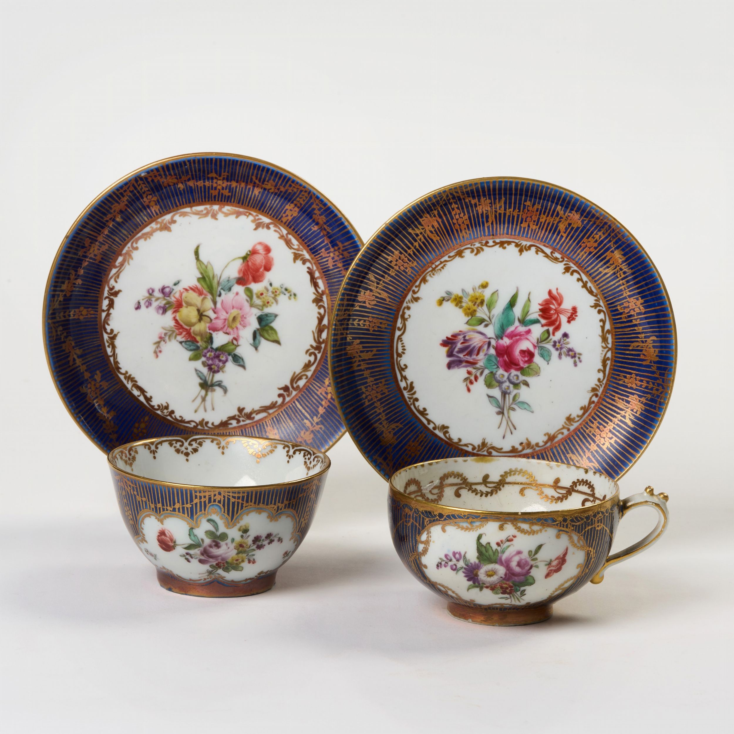 Due tazze con piattini in porcellana policroma