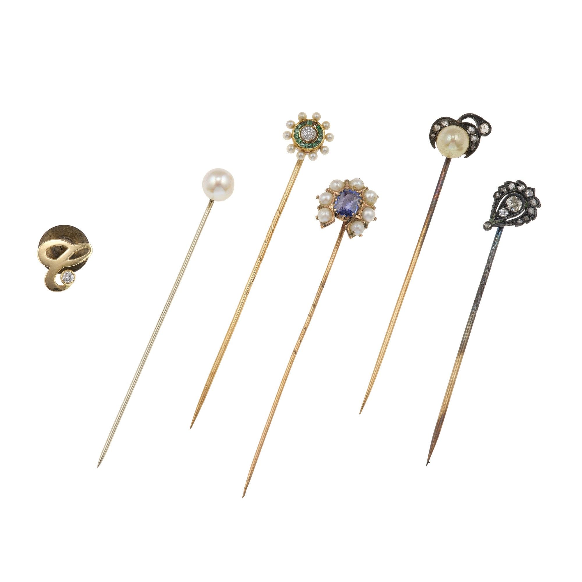 Lotto composto da 5 spilloni da cravatta ed una piccola spilla