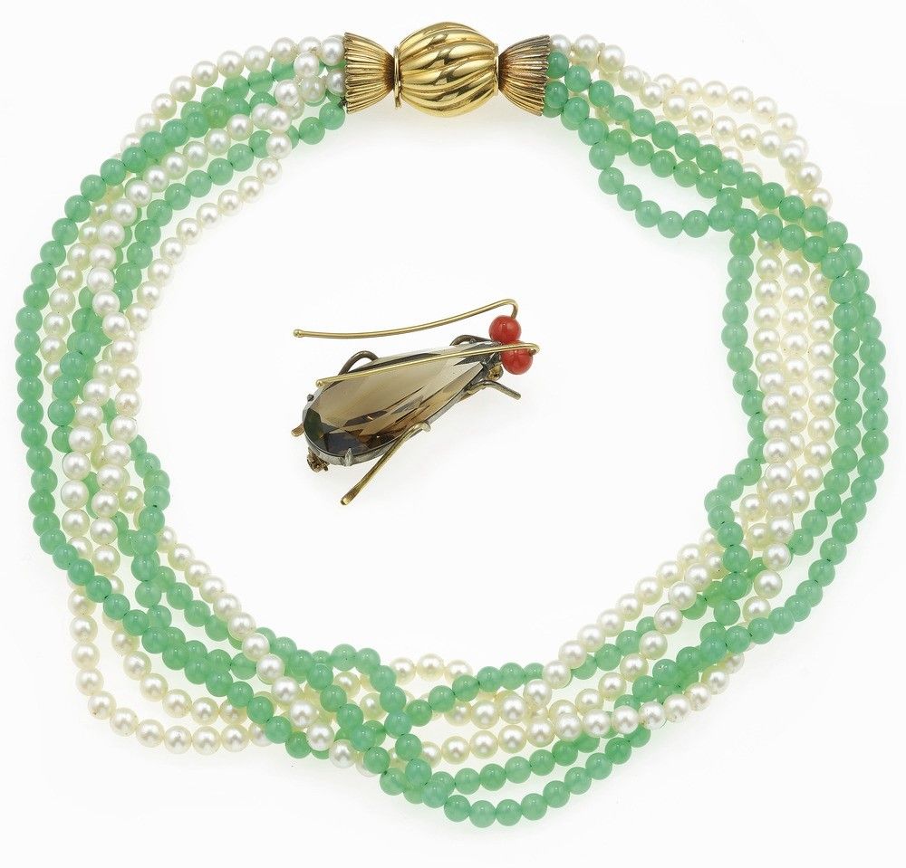 Lotto composto da girocollo a più fili con perle coltivate e calcedonio verde ed [..]