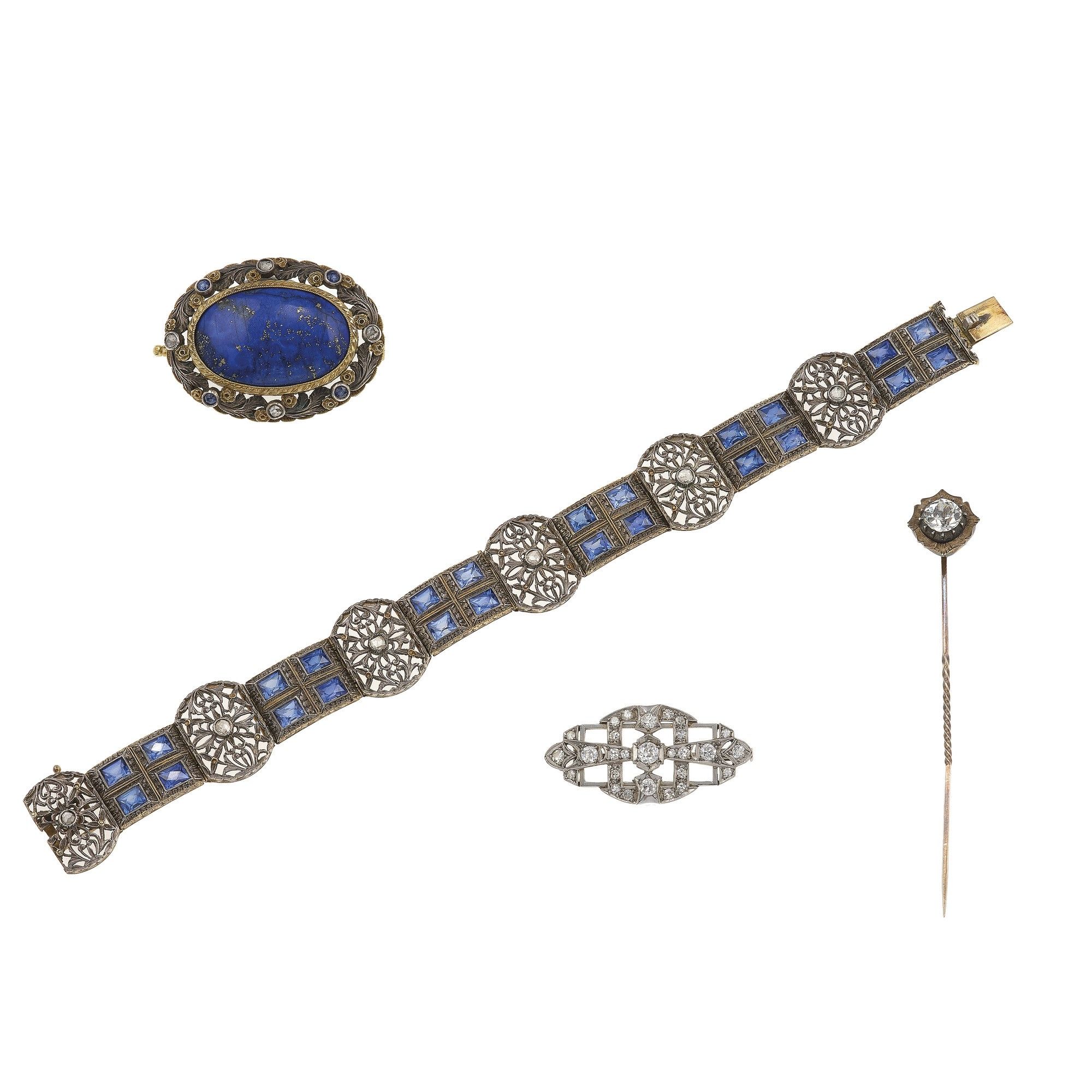 Lotto composto da un bracciale con vetri blu, spilla con lapislazzulo, spilla da [..]