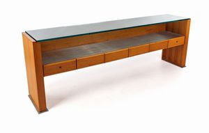 Strutura in legno, metallo e piano in vetro, cm h 82x240x47 Anni '70