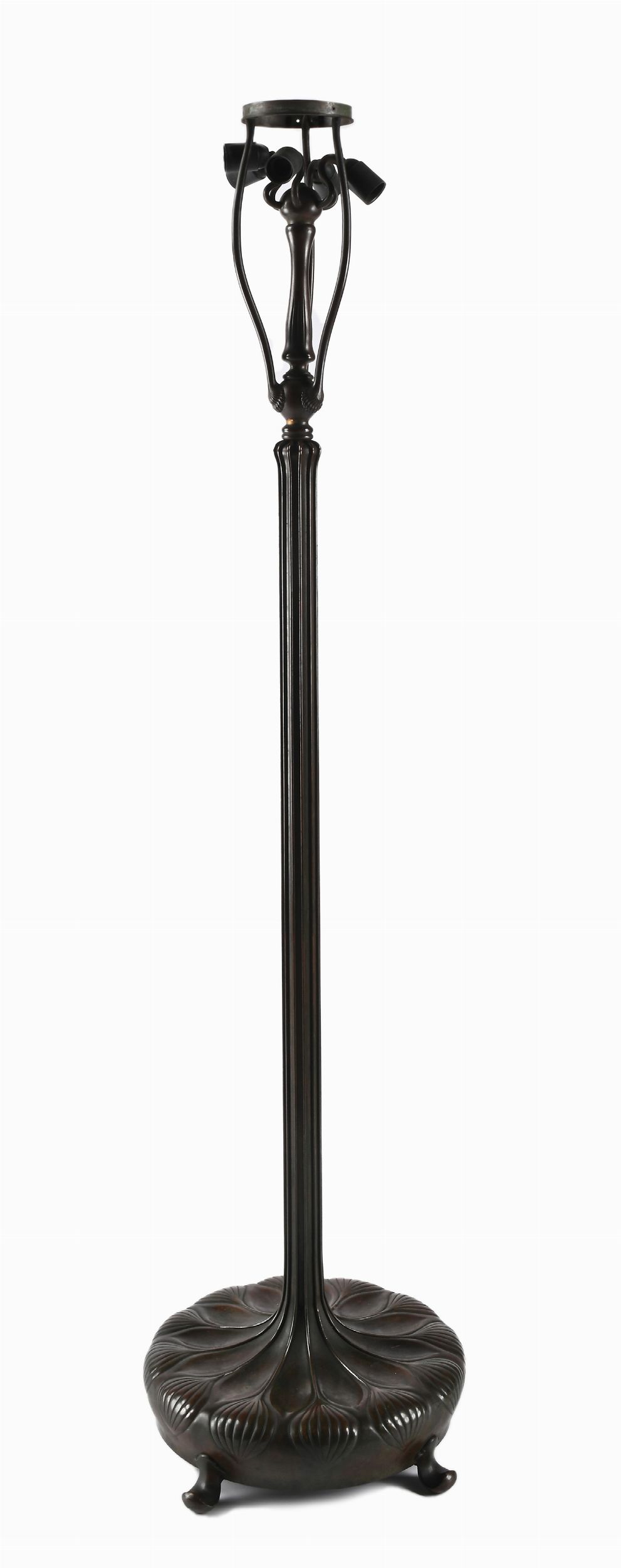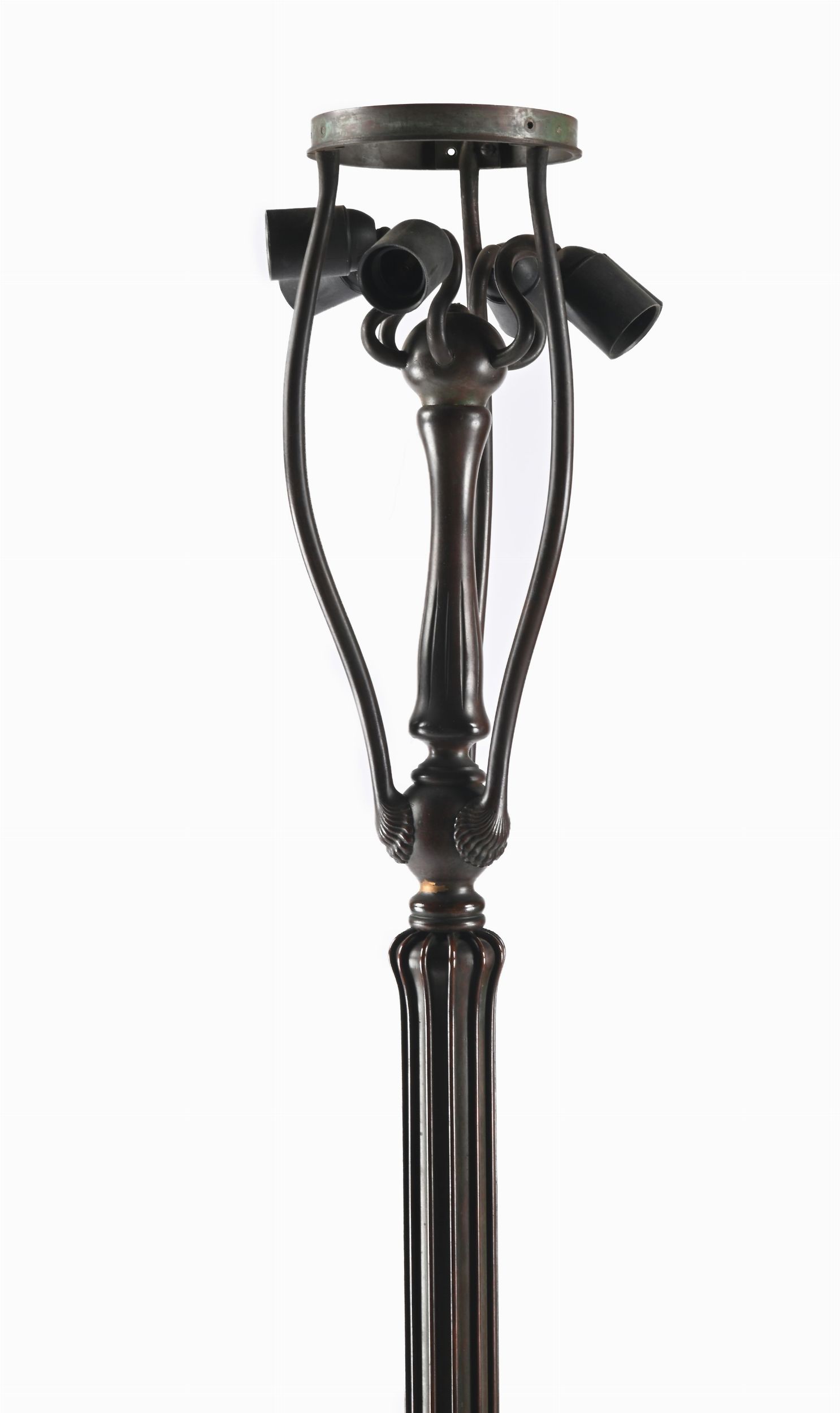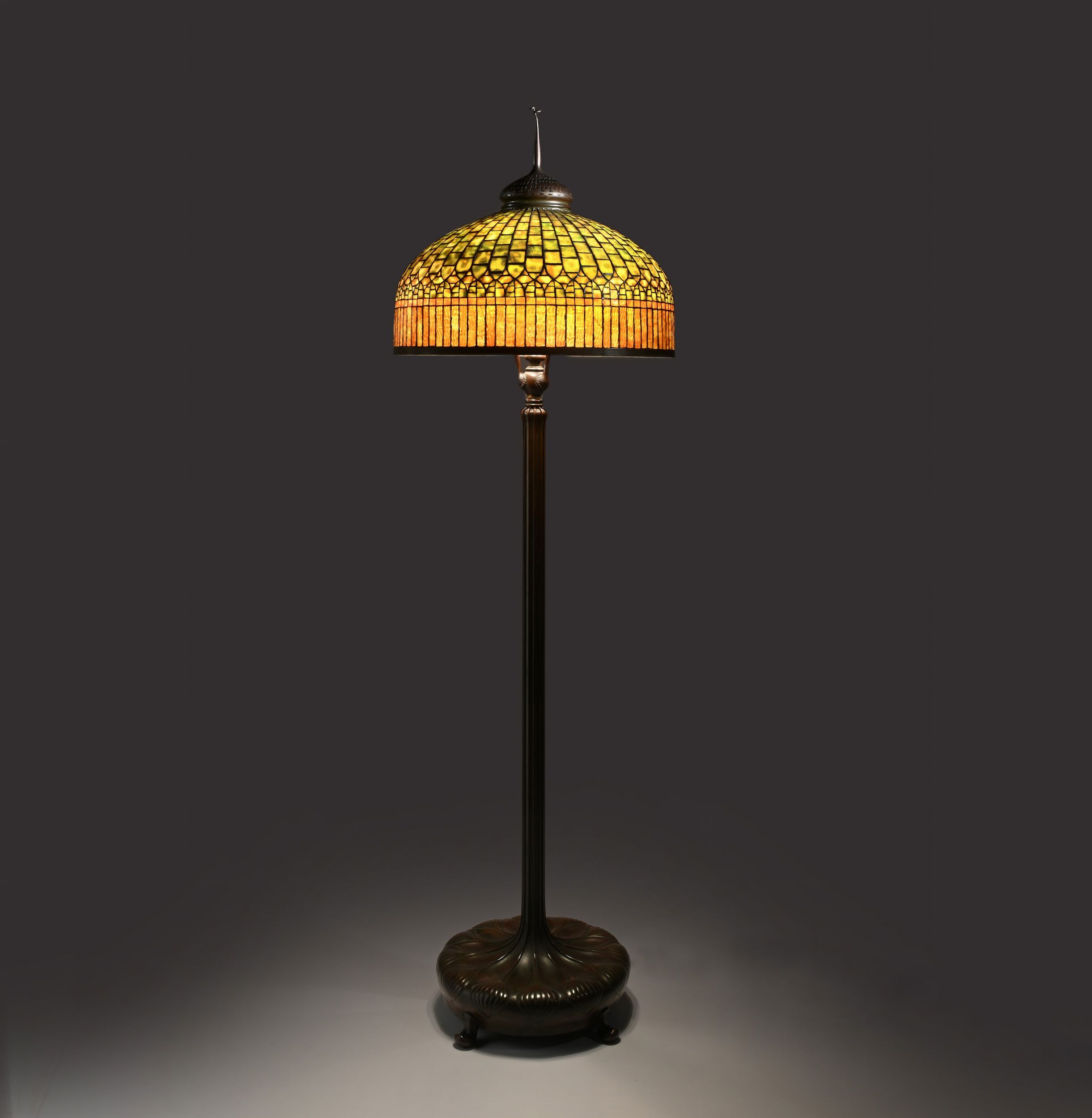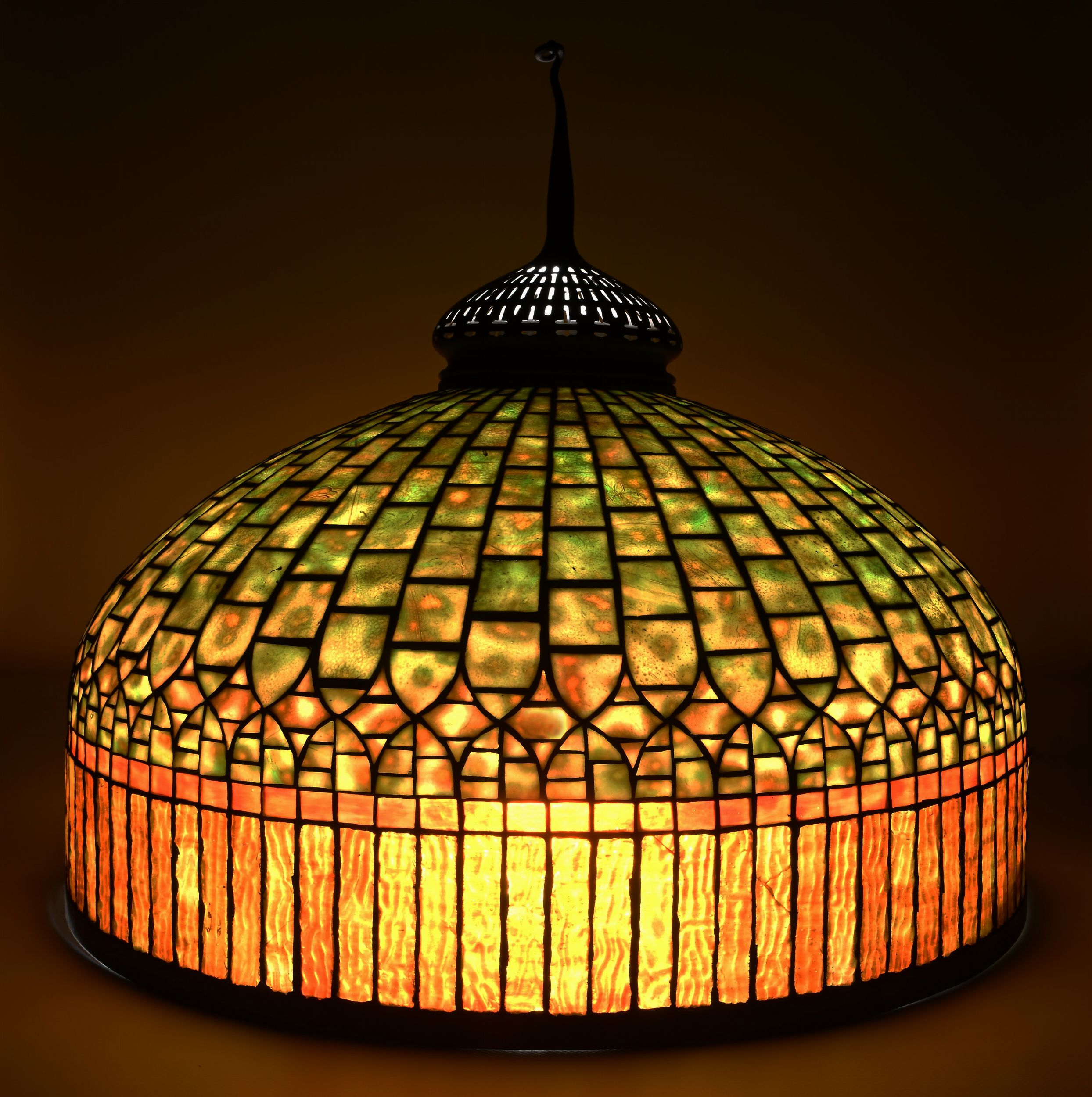 1910 ca. diffusore a cupola costituita da tessere geometriche di vetro favrile giallo ed ambra legate a piombo, con sommità a cupolino retato in bronzo con lungo ed esile vertice ritorto; base in fusione di bronzo a sei luci, con piede circolare sorretto da quattro supporti incurvati, caratterizzato da motivi a 'cipolla' disposti in sequenza lungo la circonferenza a formare una corolla di petali lanceolati; dal vertice di ogni bulbo si dipartono sottili nervature in rilievo che si distendono lungo il montante. Firma e modello impressi lungo il perimetro interno del diffusore: Tiffany Studios New York 1515; firma e modello impressi sotto la base: Tiffany Studios New York 376 Si veda per confronto: Christie's New York, 19 dicembre 2013, lotti 112 e 147 Dotato di uno spiccato senso estetico, Louis Comfort Tiffany (New York 1848 - 1933) si dedica fin da giovane alla pittura, appassionandosi alla decorazione d'interni ed esterni. Attraverso attenti studi sulla colorazione del vetro, frutto della conoscenza dell'arte antica e della tecnica vetraria veneziana apprese durante i viaggi in Europa, unitamente a una profonda riflessione sulla filosofia di William Morris, artista e scrittore fondatore delle delle Arts and Crafts, nascono i suoi vasi in vetro favrile (dall'inglese antico fabrile, 'artigianale'), dove tutte le possibilità di iridescenza e di effetto luministico e cromatico sono sperimentate per ottenere effetti sempre nuovi e sorprendenti. È grazie a questa sapiente conoscenza dei materiali e a una continua sperimentazione che le lampade realizzate dalla Tiffany Studios, esempio per eccellenza dell'Art Nouveau negli Stati Uniti, diventano famose in tutto il mondo; in queste creazioni dalle forme floreali, gioioso omaggio alla bellezza e alla vitalità della natura, protagonista assoluto è sempre il colore: 'Color is to the eye what music is to the ear' (Louis Comfort Tiffany)