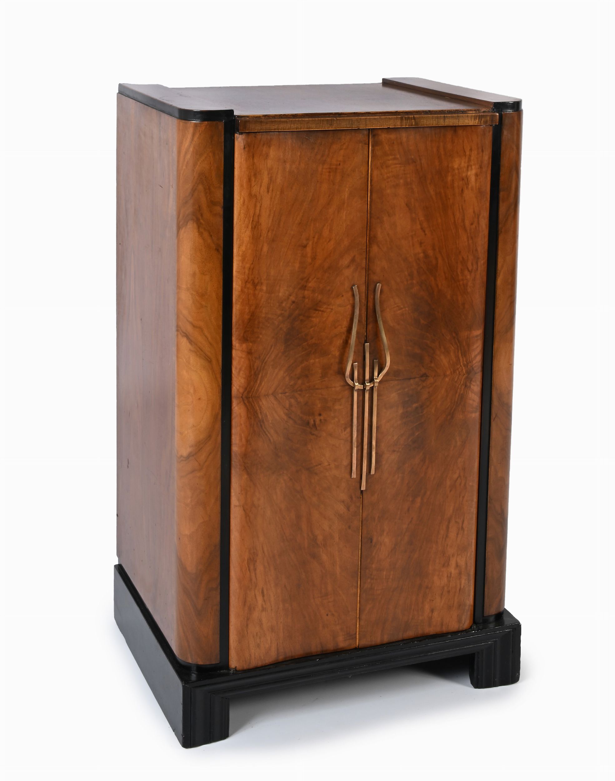 Anni '30 Mobile decò a due ante ed un ripiano interno, in pregiato legno di noce e maniglie in ottone