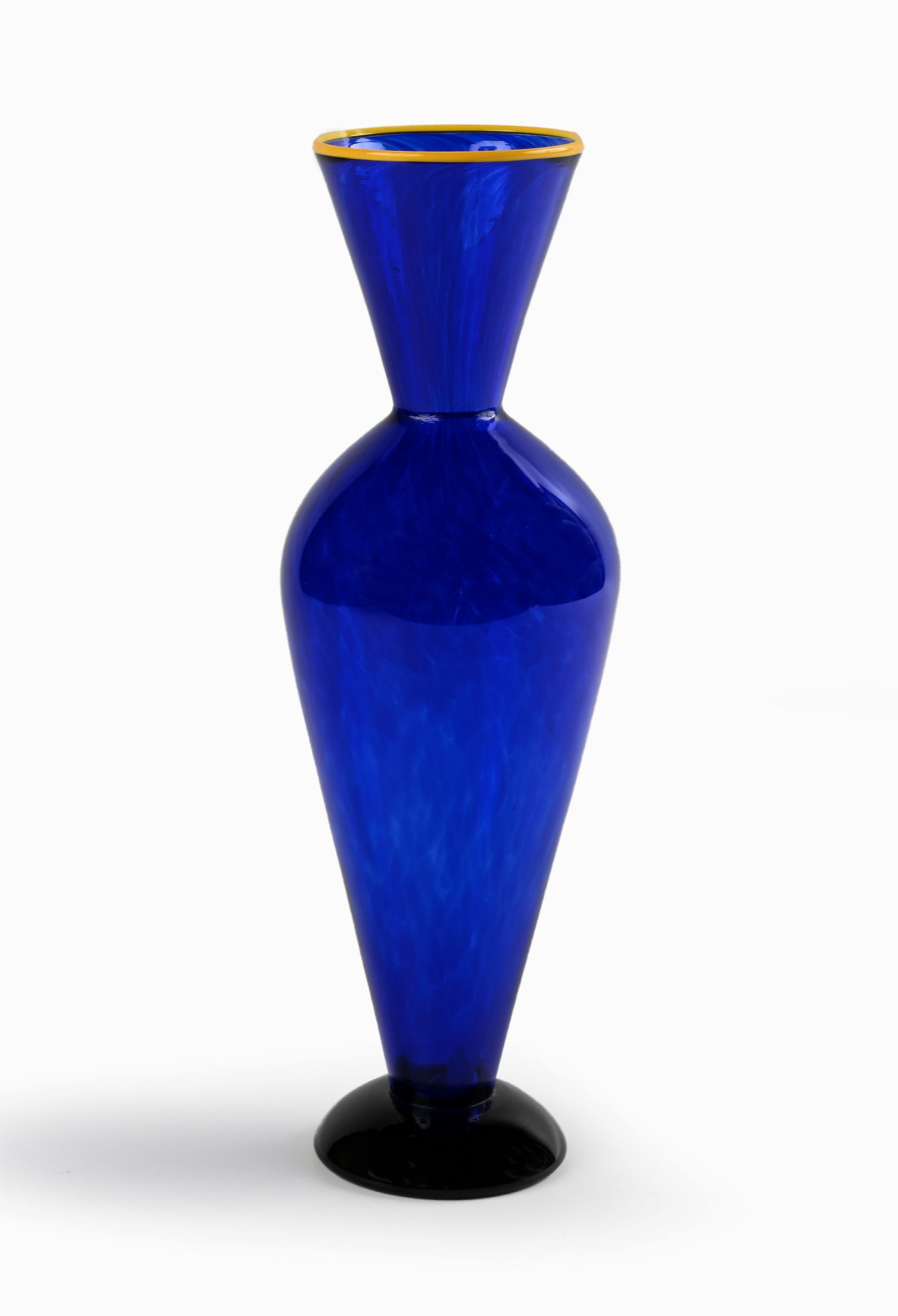 Vaso in vetro di Murano blu con base nera e bordo giallo