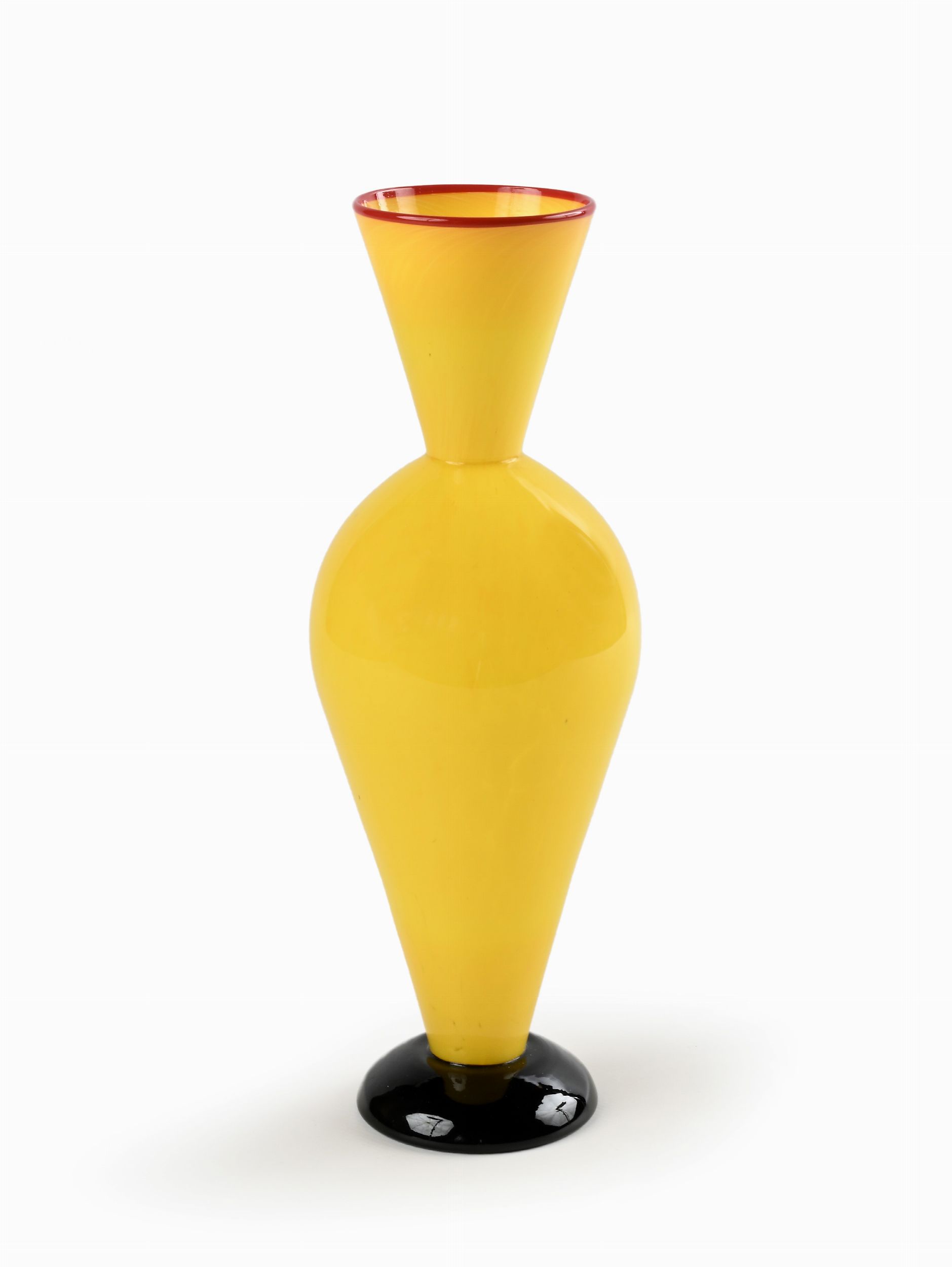 Vaso in vetro di Murano giallo con base nera e bordo superiore rosso