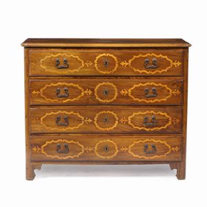 Cassettone a tre cassetti lastronato ed intarsiato. XVIII secolo