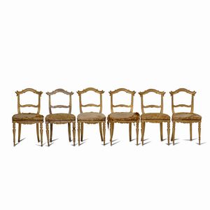 Sei sedie Luigi XIV in legno dorato, XVIII secolo